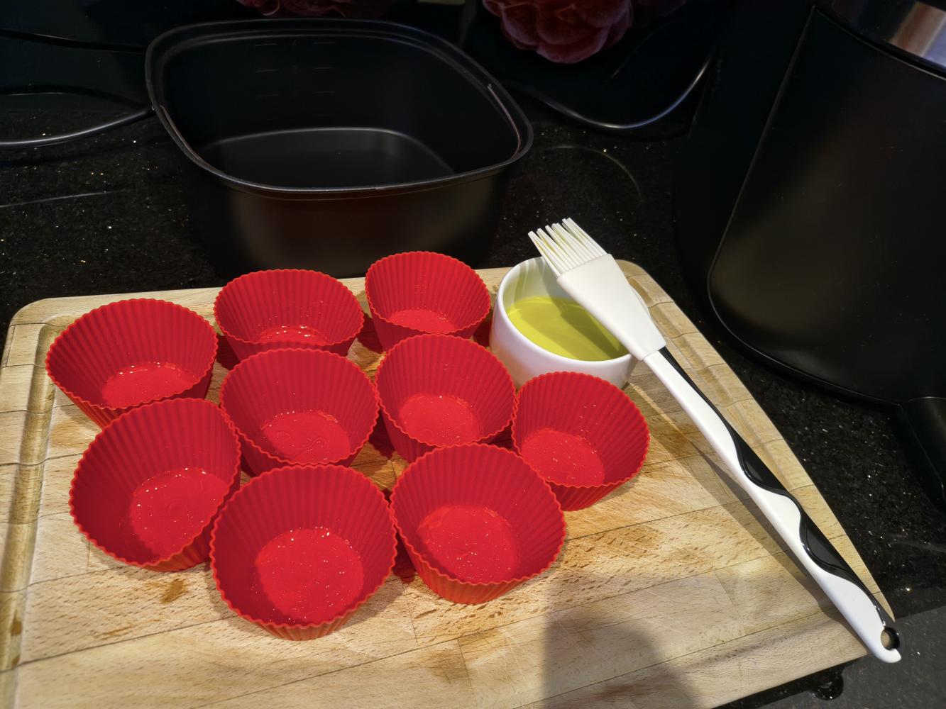 Silikonowe foremki na muffinki posmaruj oliwą za pomocą pędzelka. Jeśli używasz papierowych to możesz pominąć ten krok.