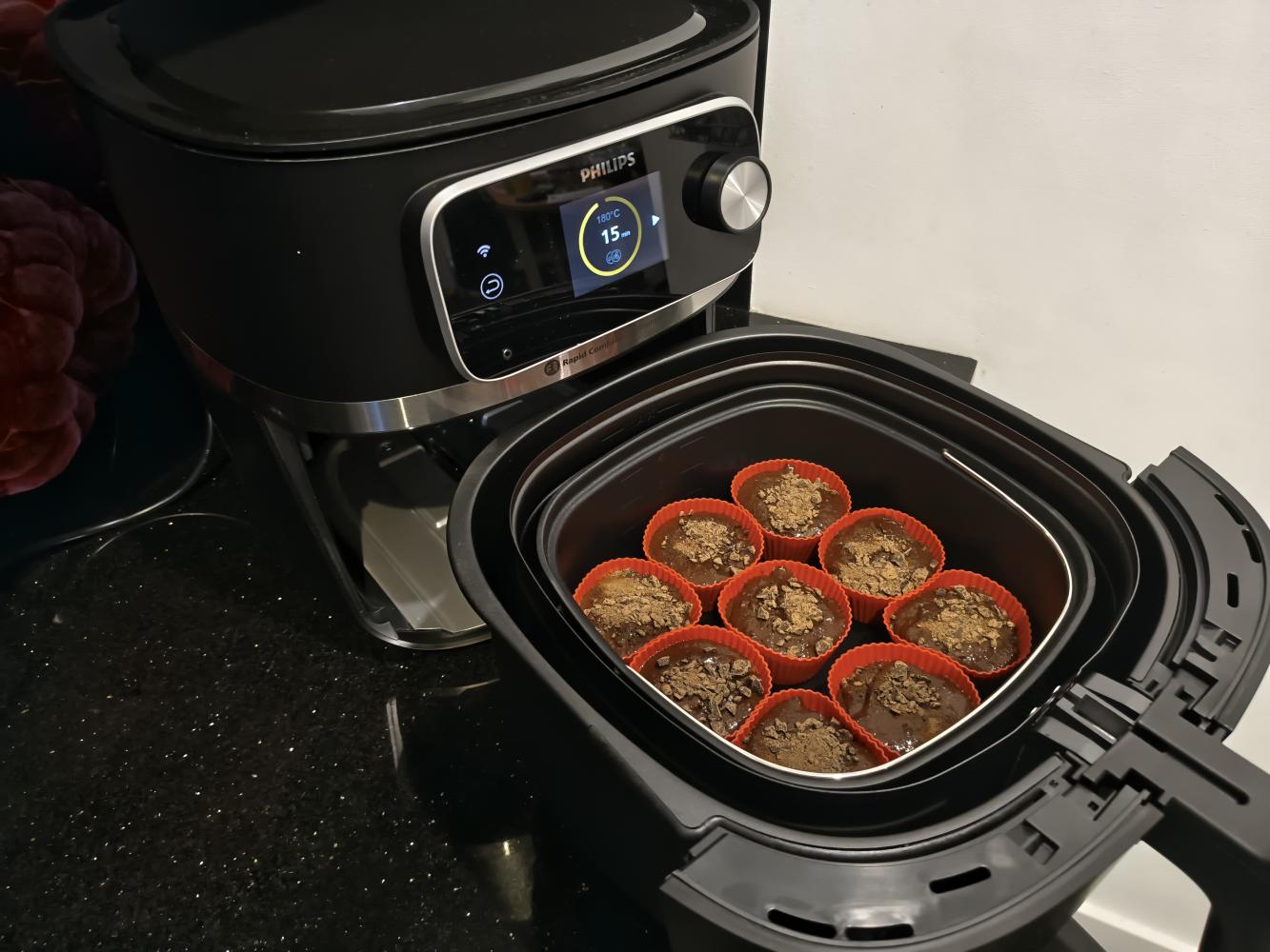 Napełnij foremki na muffinki do ok. 3/4 wysokości. Masy wystarczy na 9-10 foremek. Na wierzch posyp muffinki pozostałą połową posiekanej czekolady.