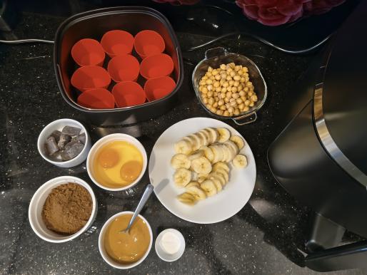 Ciecierzycę, banany, jajka, kakao, proszek do pieczenia, masło orzechowe, cukier oraz kilka kropel aromatu waniliowego zblenduj dokładnie na masę o gładkiej konsystencji.