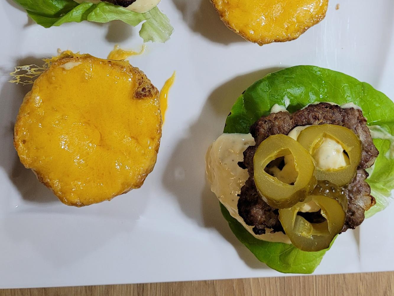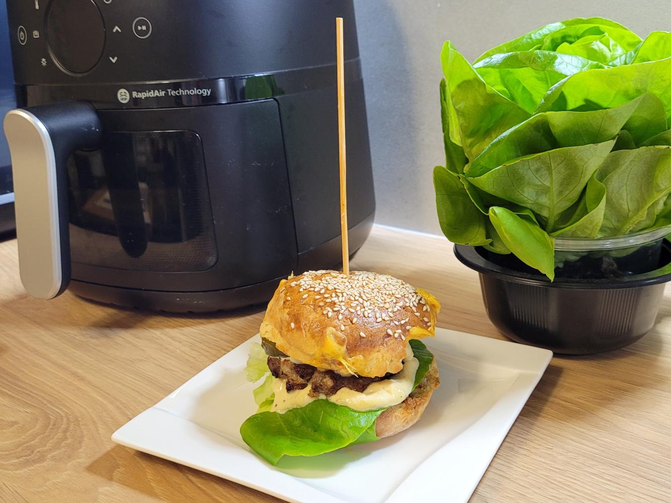 Bułki przecinamy na pół. Na spodnie bułki układamy parzony boczek, a na górne ser. Opiekamy we frytkownicy 180℃ na 4 min. Wyjmujemy bułki z frytkownicy, dodajemy sałatę, sos, kotlet i ogórek kiszony.