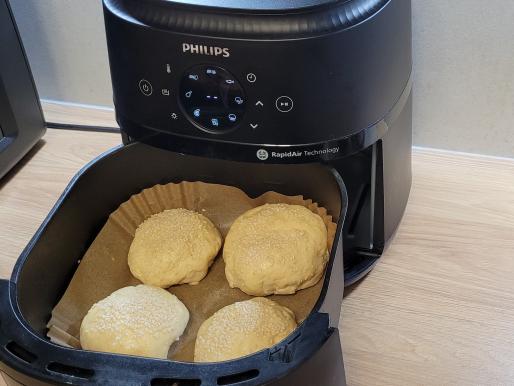 Wyrośnięte bułeczki smarujemy roztrzepanym jajkiem oraz posypujemy je sezamem. Układamy bułki na ruszcie airfryera i nastawiamy na 18 min na 170℃. W połowie pieczenia przekręcamy bułeczki na drugą stronę w celu równomiernego upieczenia. Po tym czasie wyjmujemy bułki i pozostawiamy do ostygnięcia.