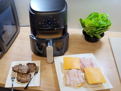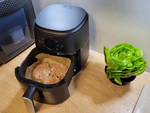 Przygotowujemy mięso. Cebulę kroimy w kostkę, wrzucamy ją do mięsa. Dodajemy 2 łyżeczki musztardy. Doprawiamy solą i pieprzem. Całość dokładnie mieszamy. Formułujemy z mięsa 6 płaskich kotletów. Kotlety układamy na ruszcie airfryera. Nastawiamy na 200℃ na 14 min, w połowie pieczenia przekręcamy kotlety na drugą stronę.