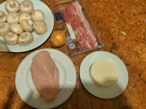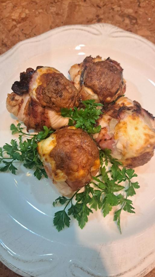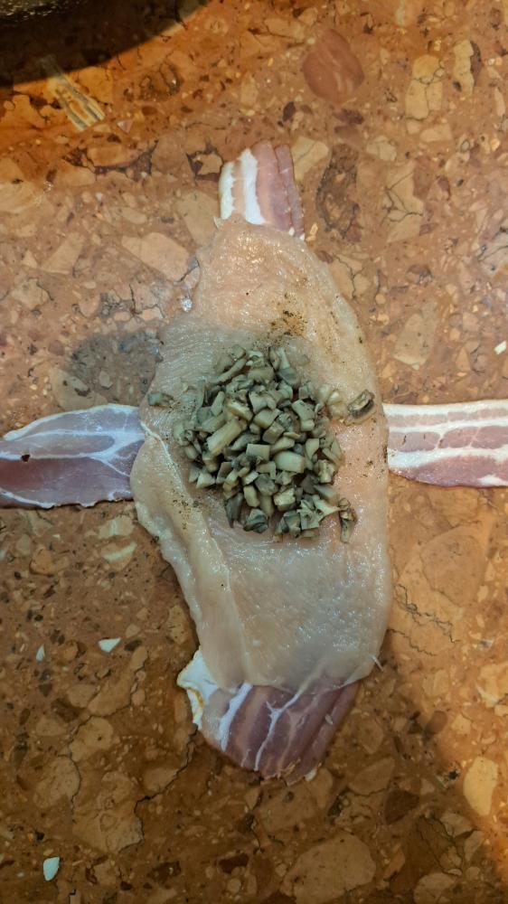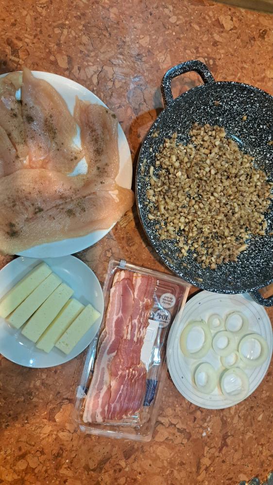 następnie skladamy kuleczki: dwa plasty boczku położyć na krzyż, na boczek kładziemy fileta z kurczaka doprawiongo solą i pieprzem na to przysmażone pieczarki, całość zawijamy przekładając przez cebulowe krążki, na koniec w środek wkładamy ser.