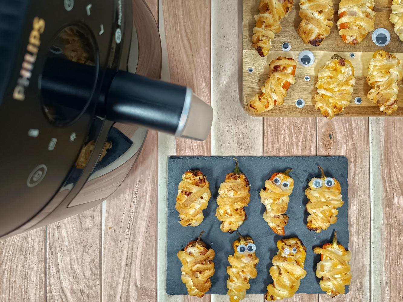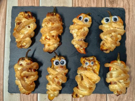 - Z ciasta francuskiego robimy bandaże mumii, owijając je dookoła papryczek.