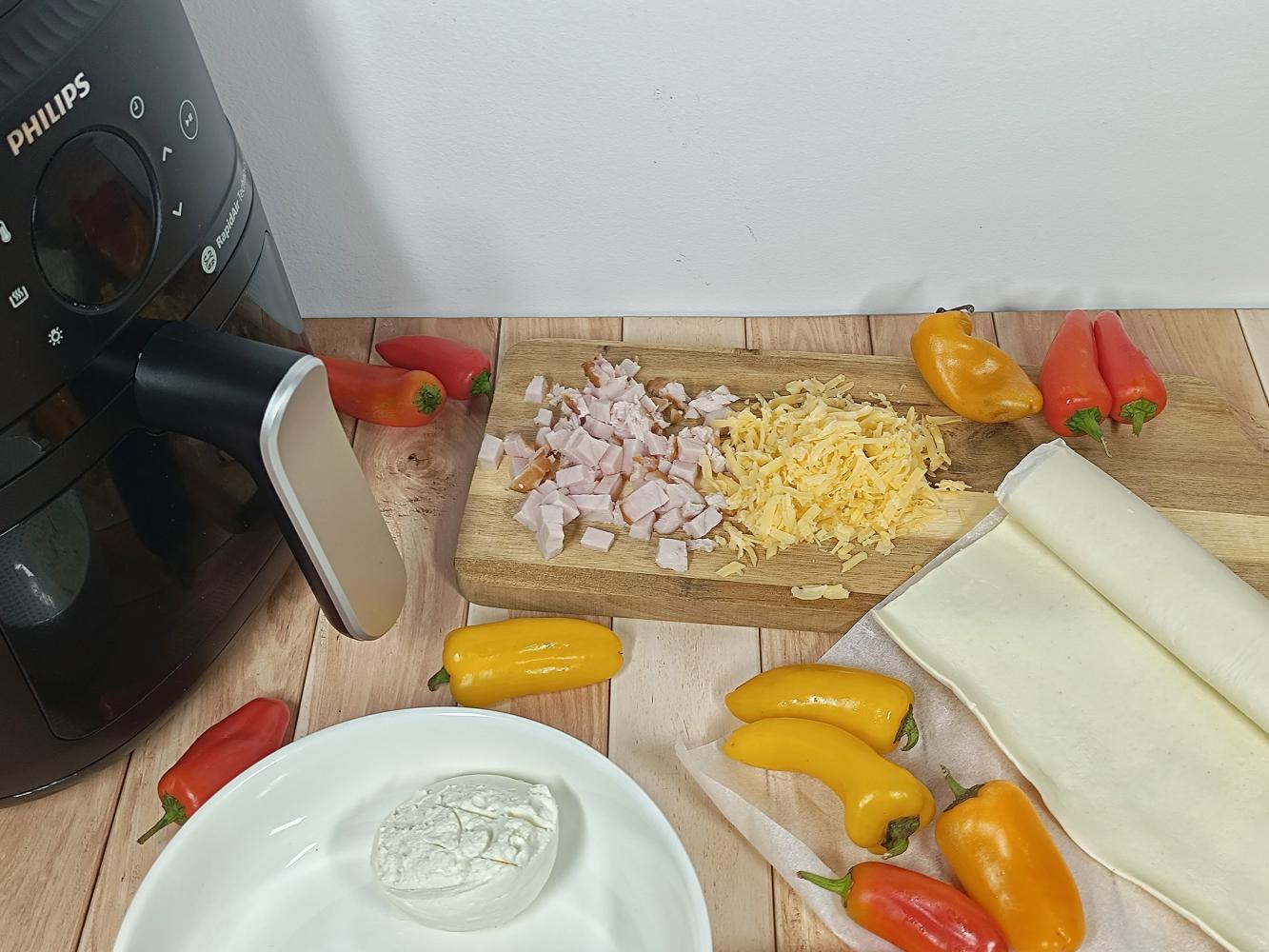 - Ser, szynkę, kremowy serek i przyprawy mieszamy w misce.