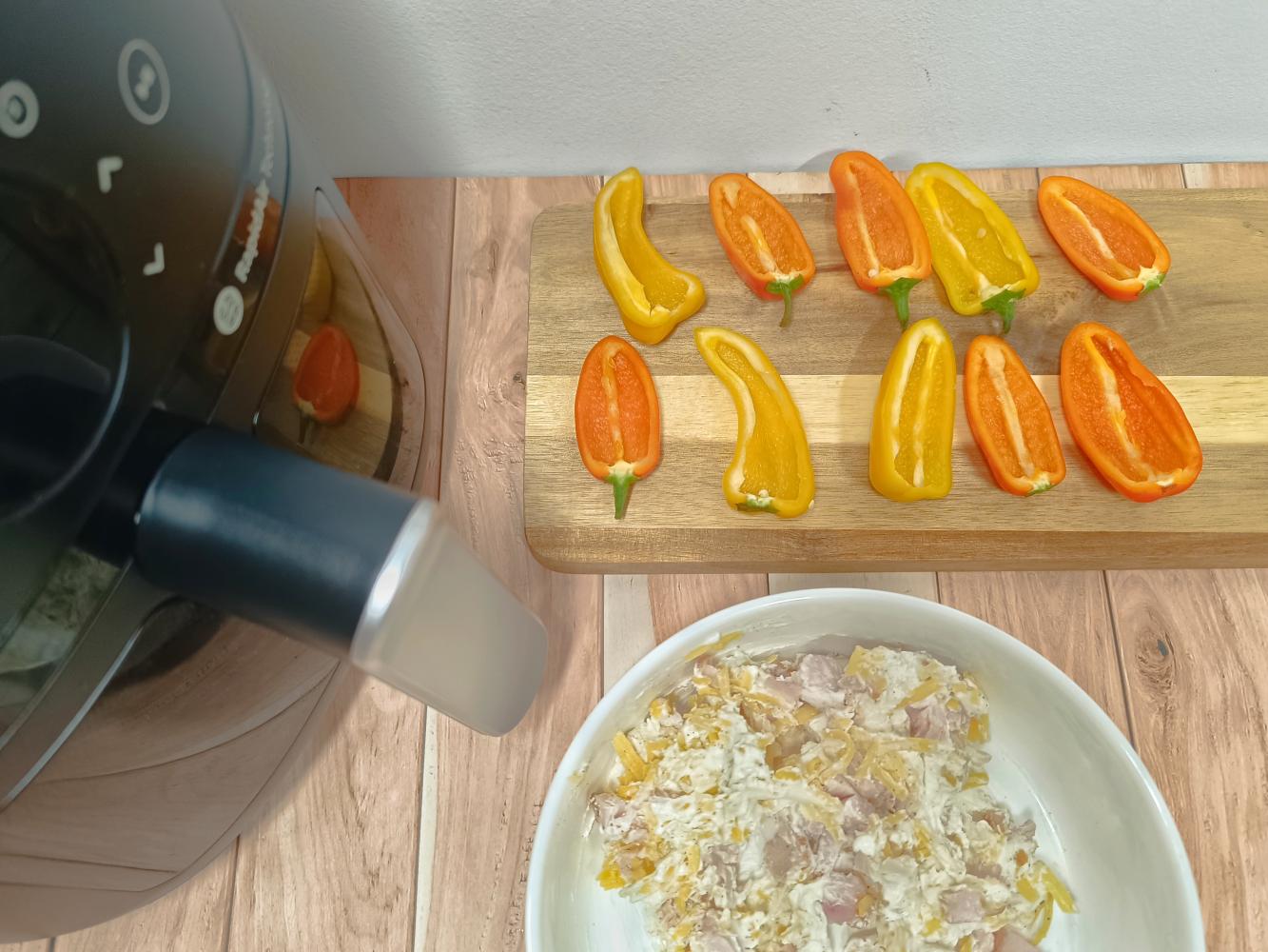 - Papryczki przekrajamy na połówki i usuwamy gniazda nasienne.