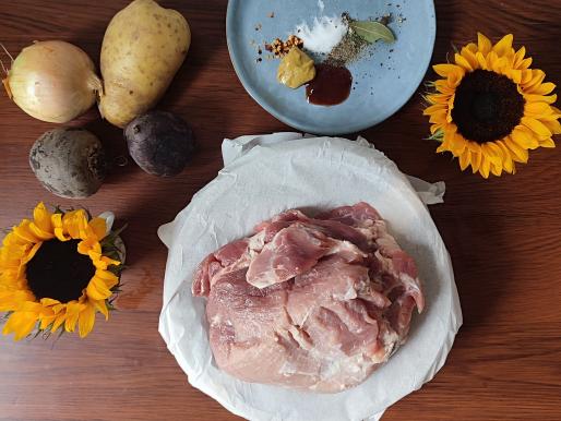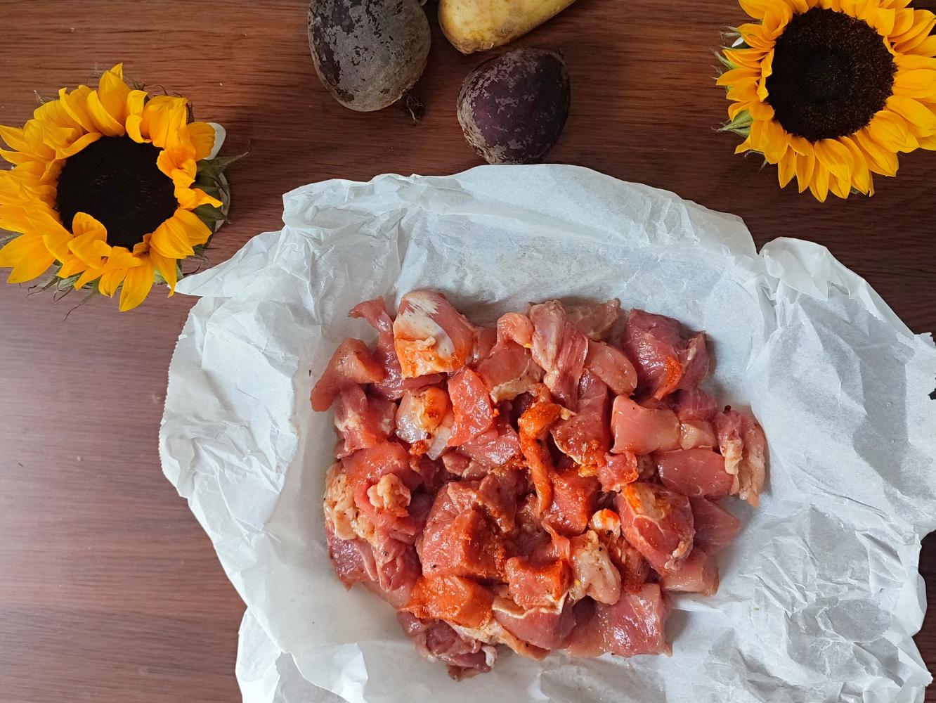 Szynkę wieprzową kroimy na kawałki i doprawiamy przyprawami.