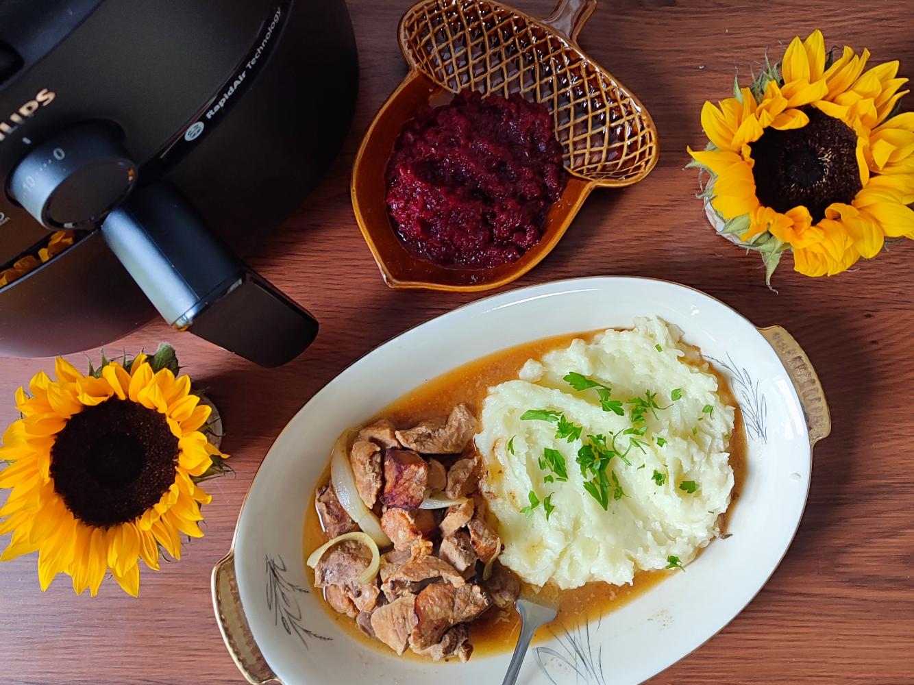 Gulasz wieprzowy z puree i buraczkami