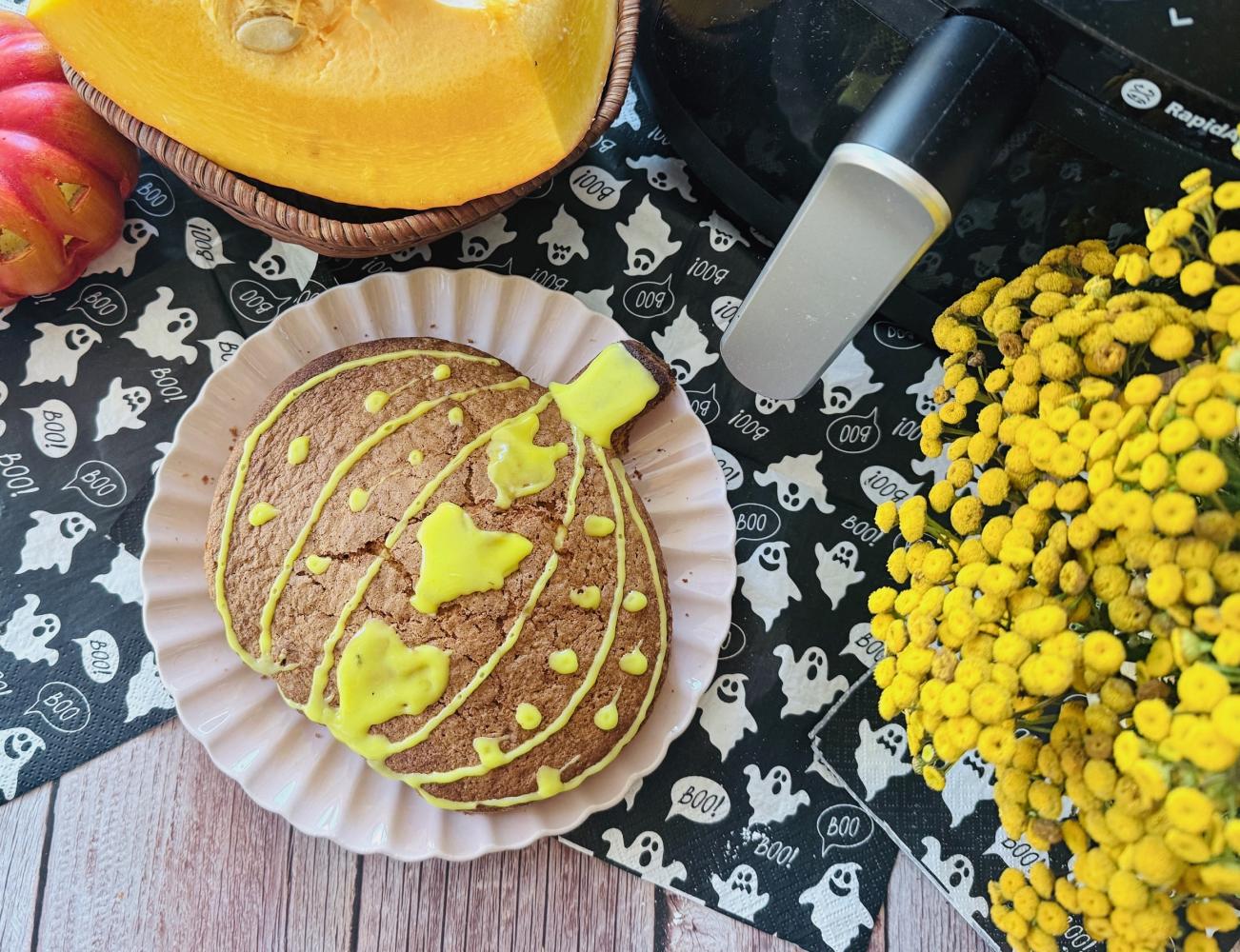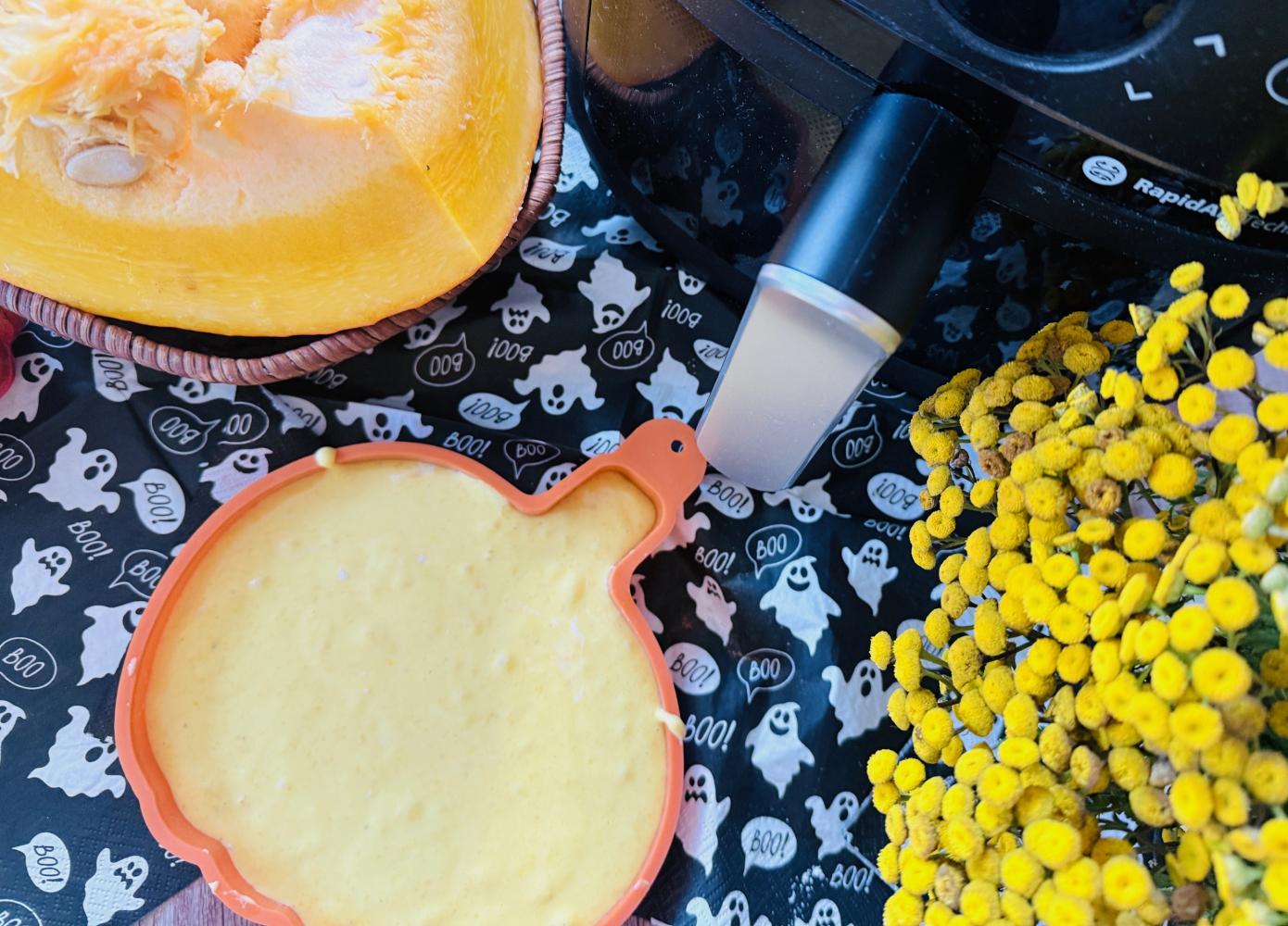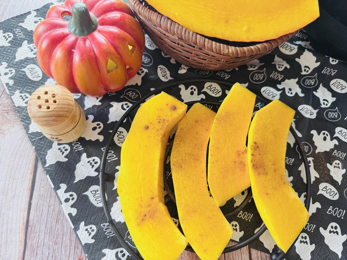 Dynię umyj, wydrąż z nasion i obierz ze skóry. Pokrój ją na mniejsze kawałki, posyp cynamonem, ułóż na papierze do pieczenia i umieść we frytkownicy nagrzanej 160st. C. Dynię piecz około 25-35 minut aż będzie miękka.