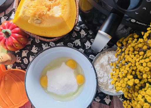 Dynię ostudź i dokładnie zmiksuj na gładką pulpę. Jajka ubij z cukrem na puszystą masę. Cukier nie powinien być wyczuwalny. Do puchu jajecznego dodaj olej oraz zmiksowaną dynię. Całość ubijaj przez chwile do połączenia się składników.