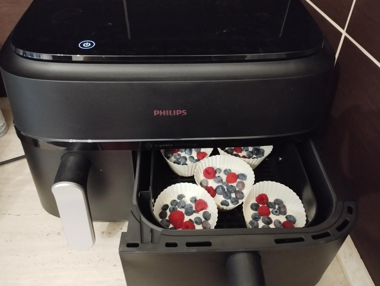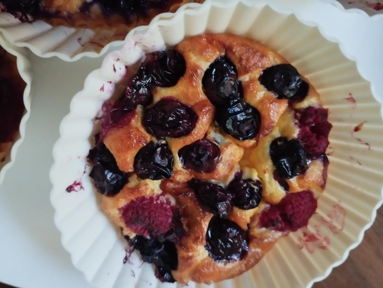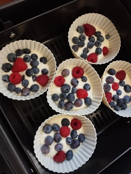 Przełożyć do foremek na muffinki i posypać owocami.