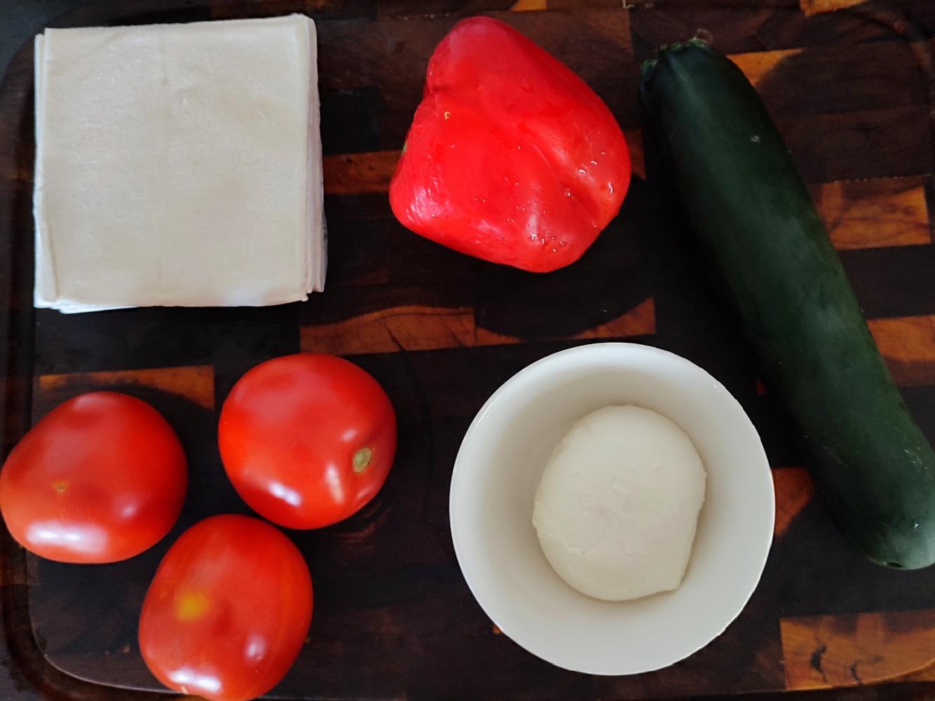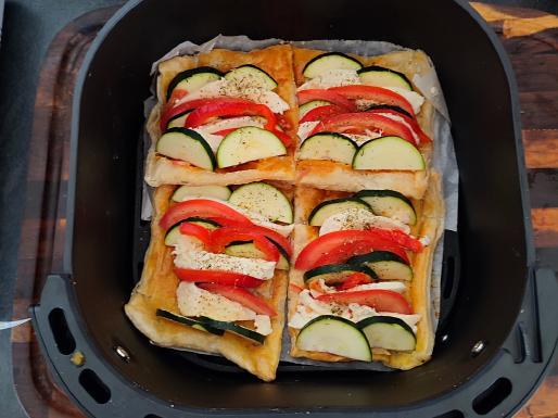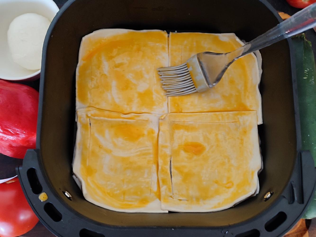 Po upieczeniu wykładamy warzywa na zmianę z mozzarellą w wycięty kwadrat ciasta francuskiego