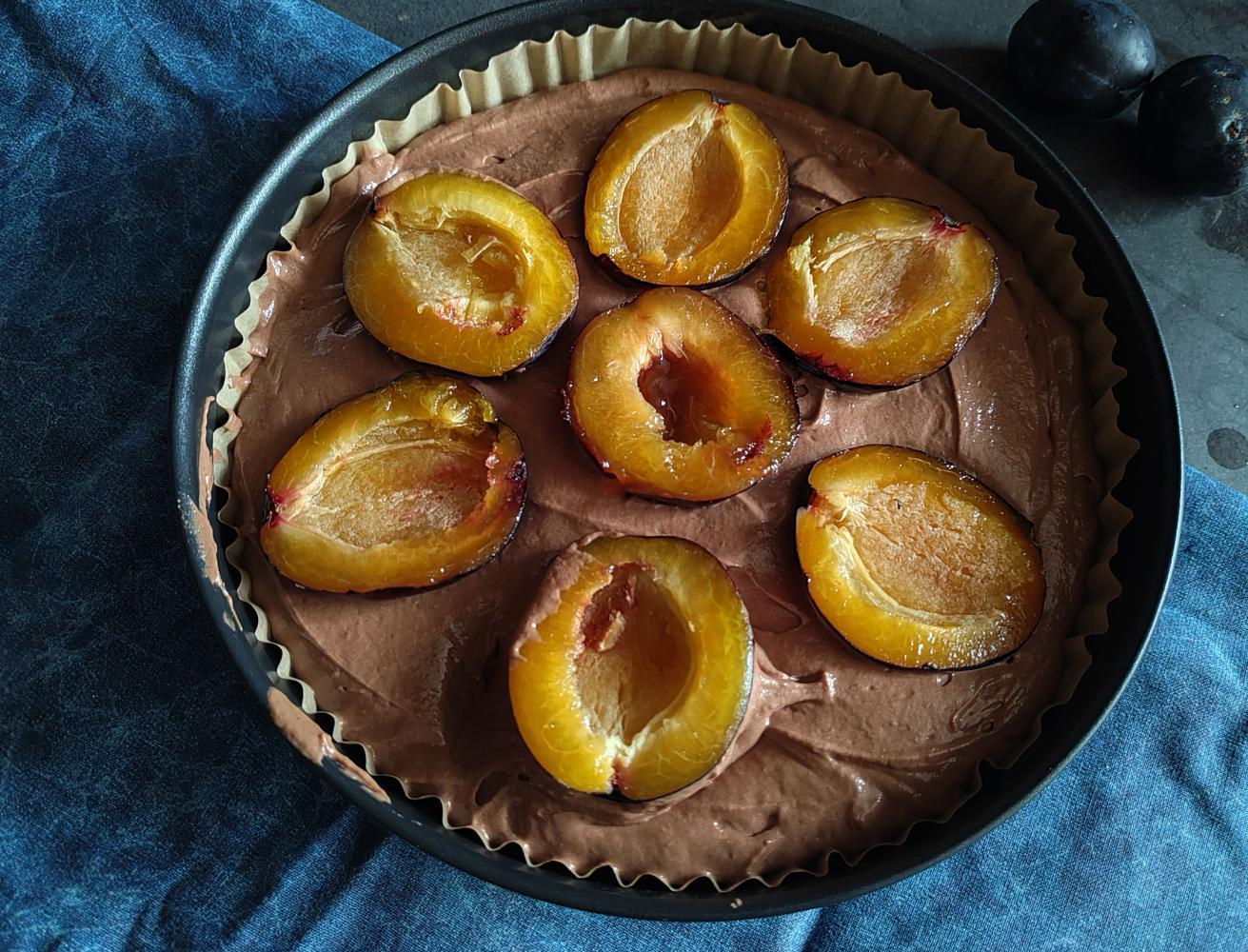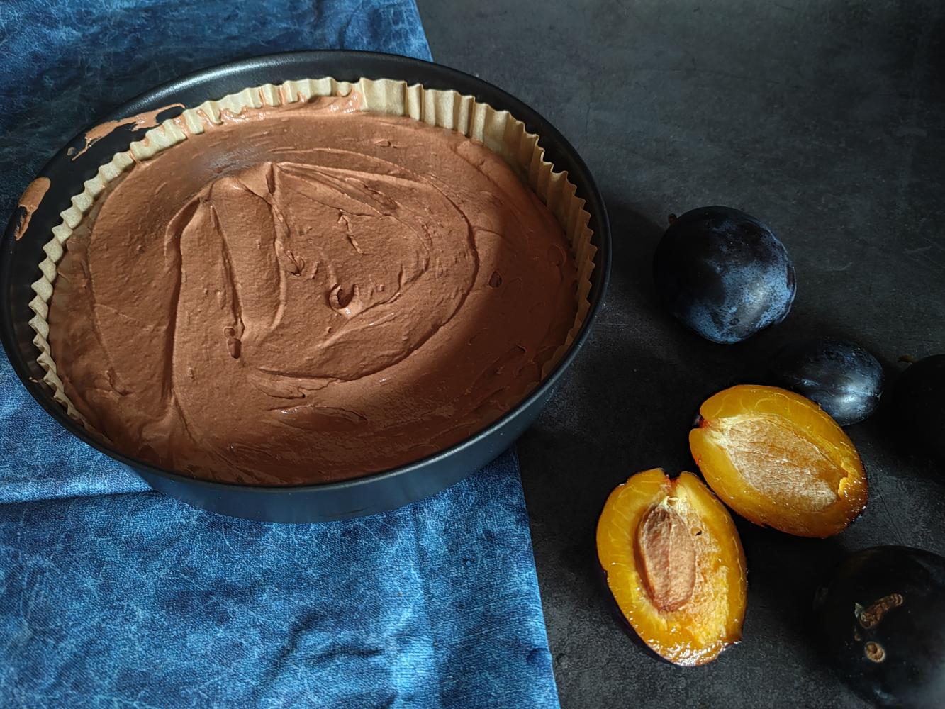 - Przelej do formy, na wierzchu ułóż połówki śliwek węgierki.
