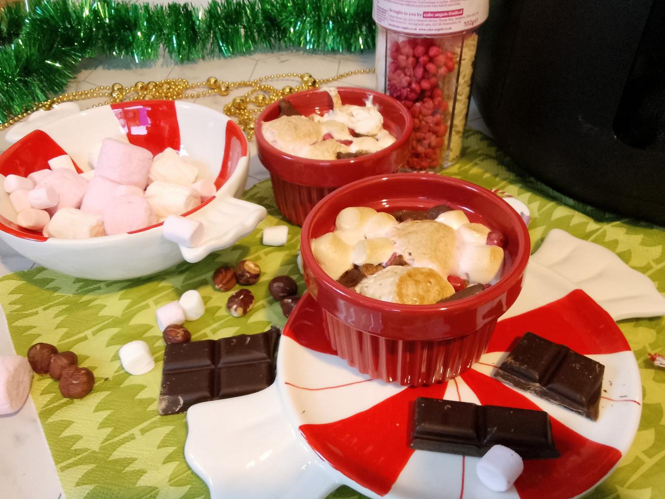 Do każdej foremki nakladamy garść pianek oraz kilka kostek gorzkiej czekolady. Pozna dodac kolorowa posypkę cukrową.