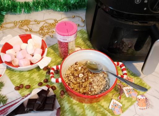 Orzechy drobno siekamy, a następnie mieszamy z miodem i olejem. Rozkładamy na pergaminie i pieczemy przez ok.10 minut aż się zarumienią.