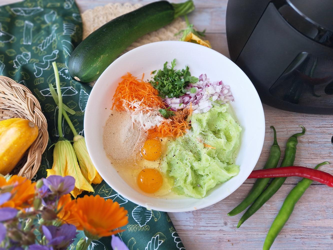 Do odciśniętej cukinii dodać obraną i startą marchewkę, przeciśnięty przez praskę czosnek, oliwę, bułkę tartą, natkę pietruszki i jajka. Doprawić pieprzem, solą i paprykę.