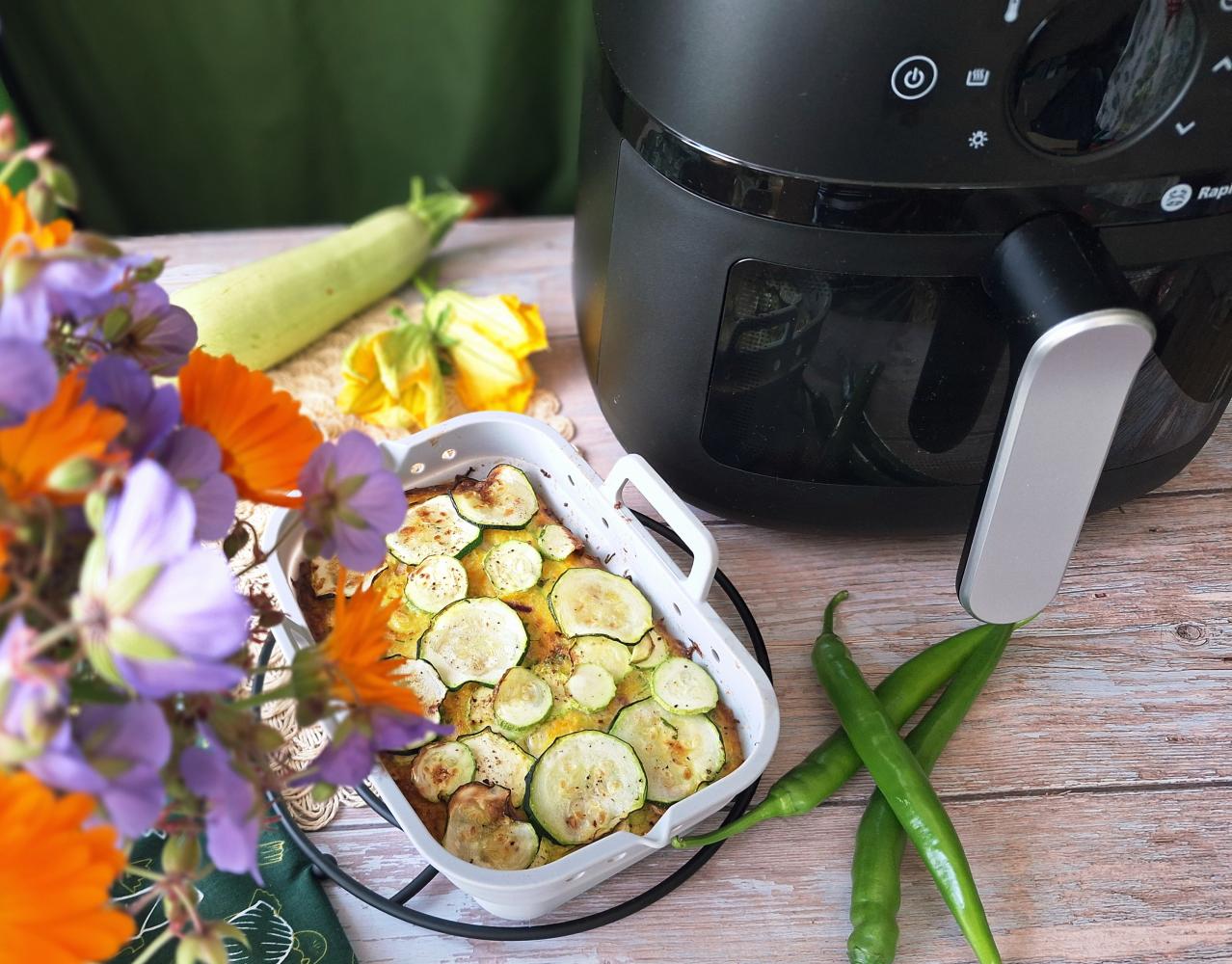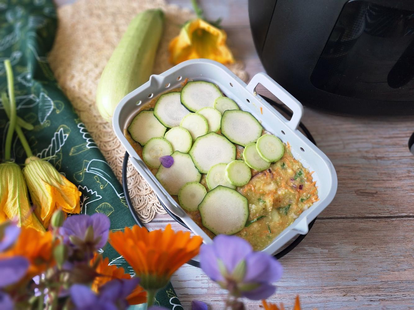 Masę przełożyć do wąskiej formy, wyrównać łyżką. Z wierzchu udekorować cukinią, posypać solą i pieprzem, posmarować oliwą.