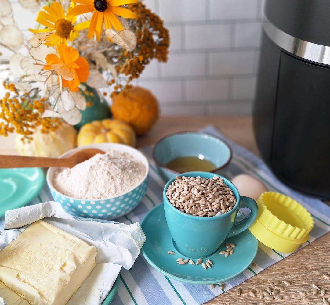Po rozwałkowaniu ciasta na grubość około 0,5 cm, wycinamy foremką kółka i na każde nakładamy słonecznik z miodem.