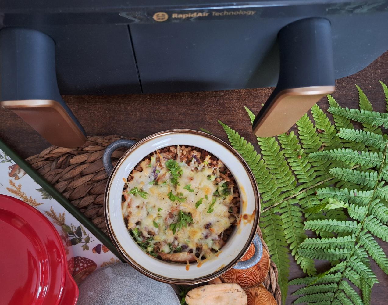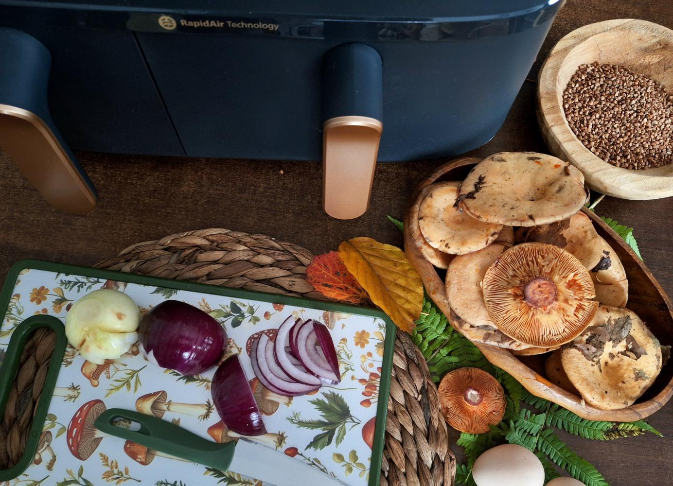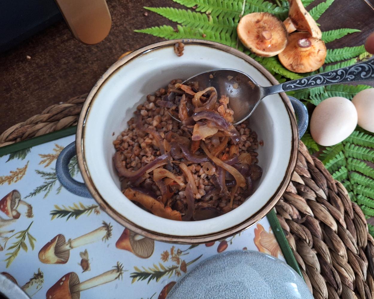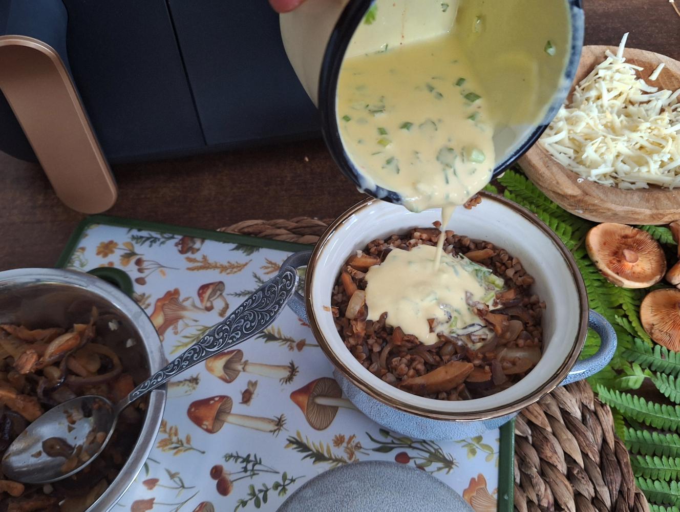 Na dno naczynia żaroodpornego nakładamy warstwą ugotowanej kaszy gryczanej, następnie warstwę duszonych rydzów.