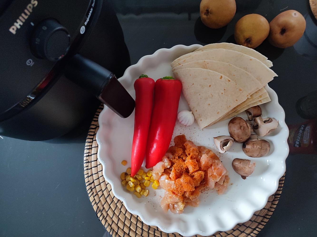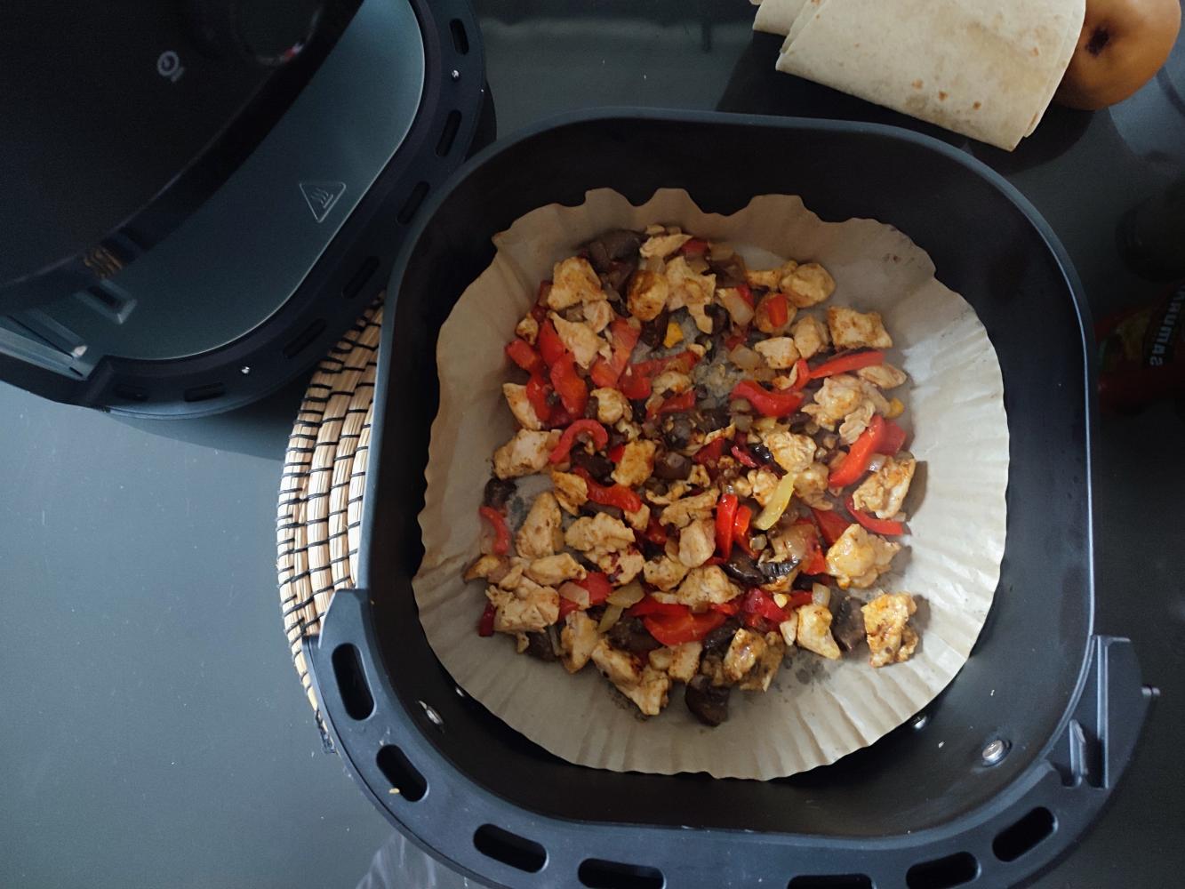 Na papierową formę do pieczenia rozkładamy mięso i warzywa. Wkładamy do misy Airfryera i pieczemy 12 minut w 180 stopniach.