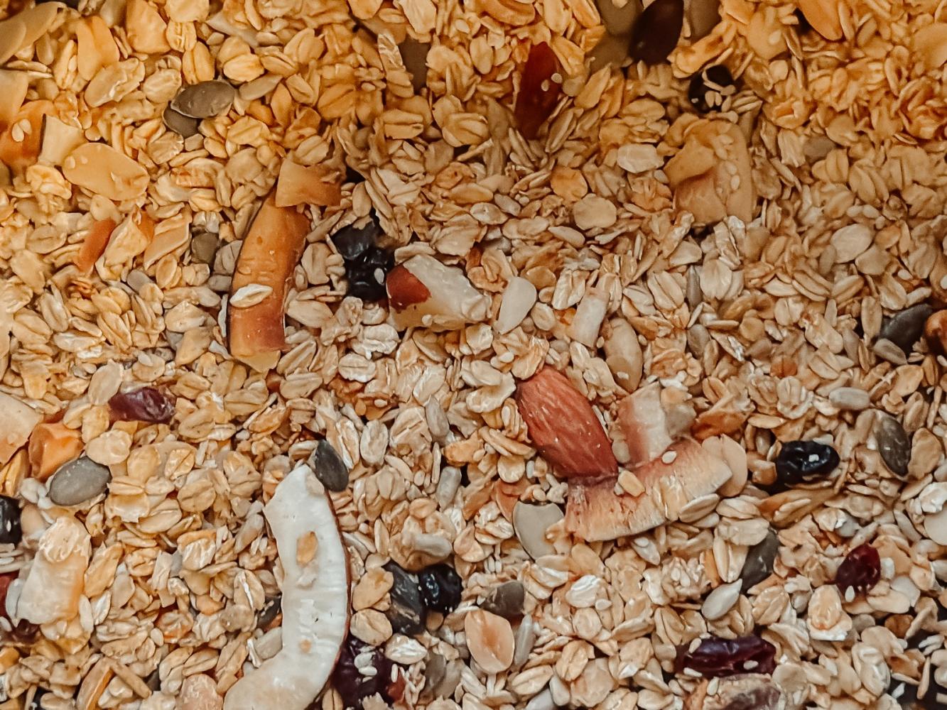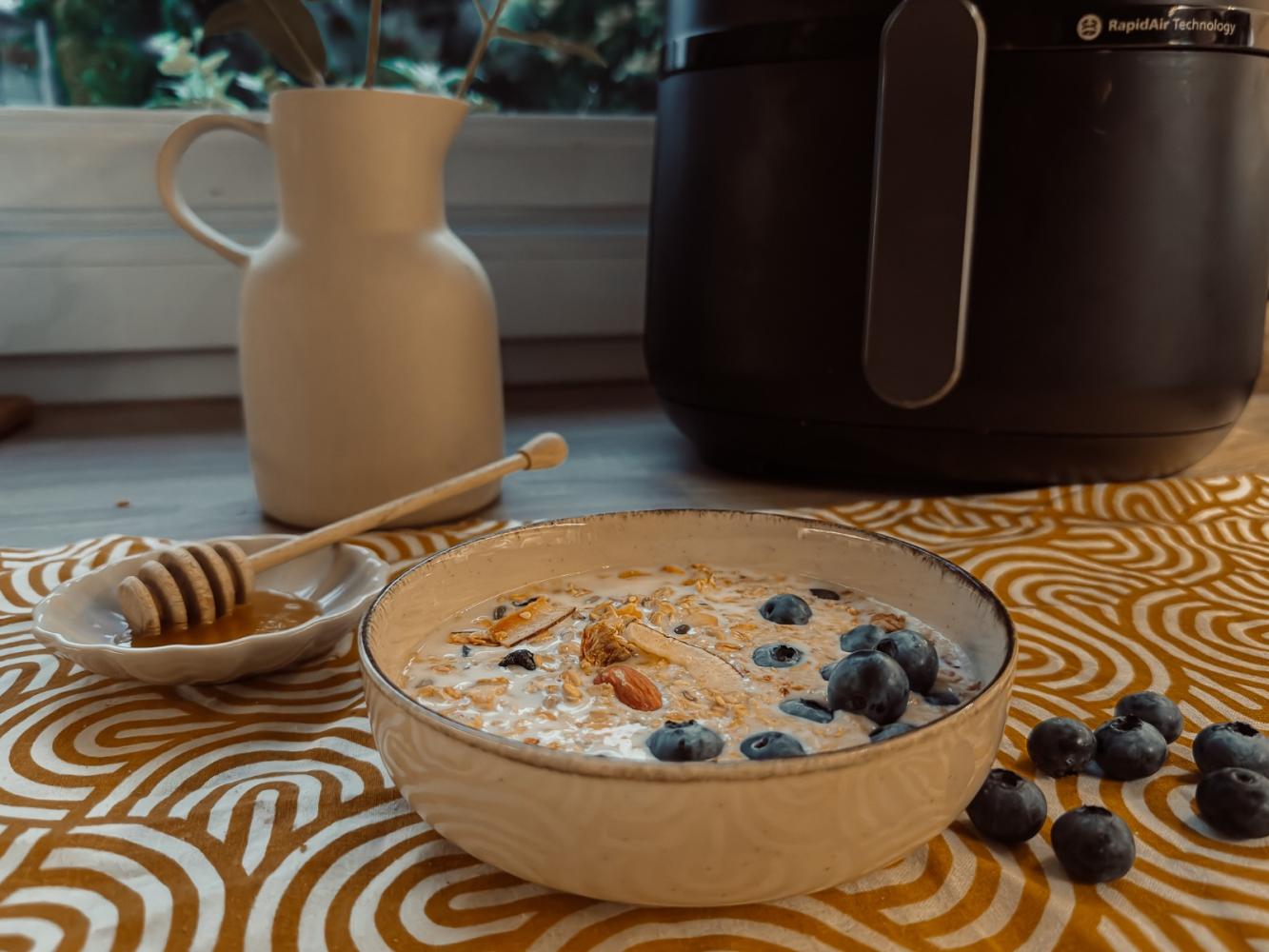 Przygotuj kosz – wyłóż kosz airfryera papierem do pieczenia i rozprowadź granolę równą warstwą.