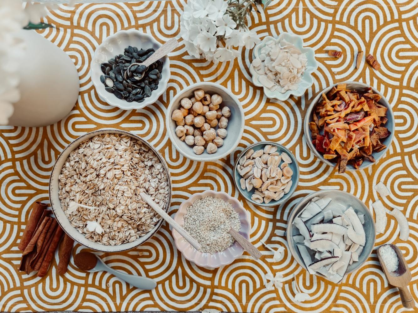 Słoneczna zdrowa domowa granola z mango i zieloną herbatą