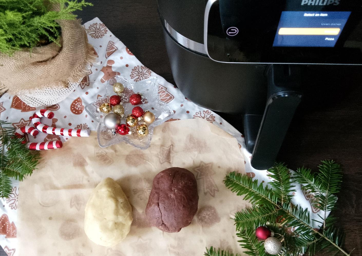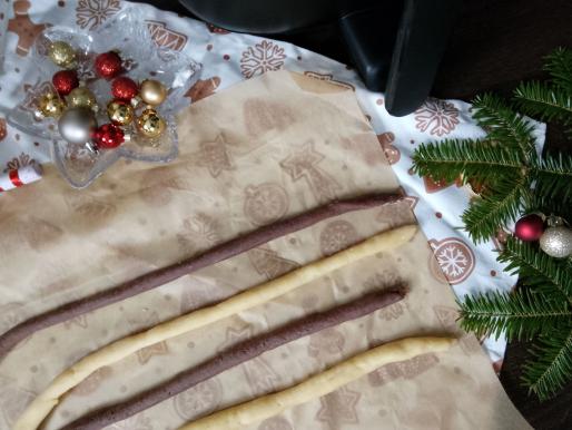 Ciasto dzielimy na dwie części, do jednej z nich dodajemy kakao i powtórnie wyrabiamy. Obie kule odstawiamy do schłodzenia do lodówki. Z ciasta robimy wałeczki o średnicy ok. 1 cm i splatamy.