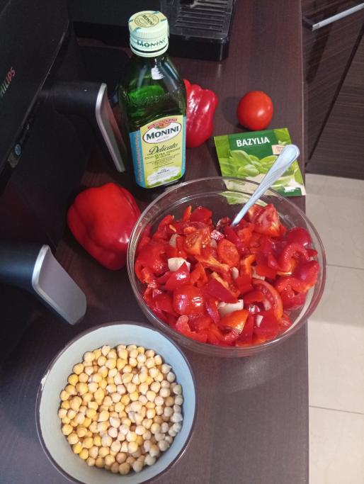 Paprykę, pomidory i cebulę kroimy, posypujemy przyprawami, skrapiamy 2 łyżkami oliwy z oliwek, mieszkamy.
