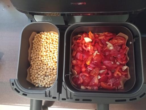 W większym pojemniku wykładamy papier do pieczenia u przekładamy warzywa. Ciecierzycę skrapiamy 2 łyżkami oliwy z oliwek i przekładamy do mniejszego pojemnika wyłożonego papierem do pieczenia.