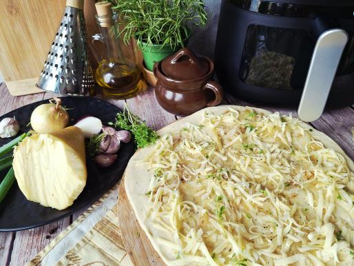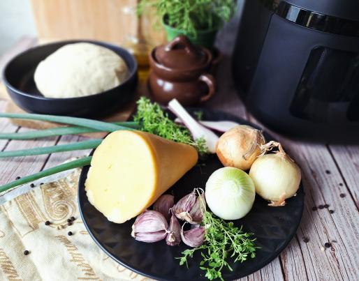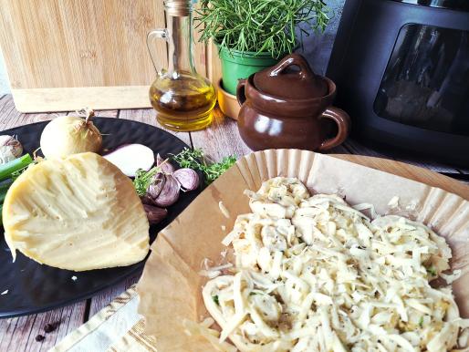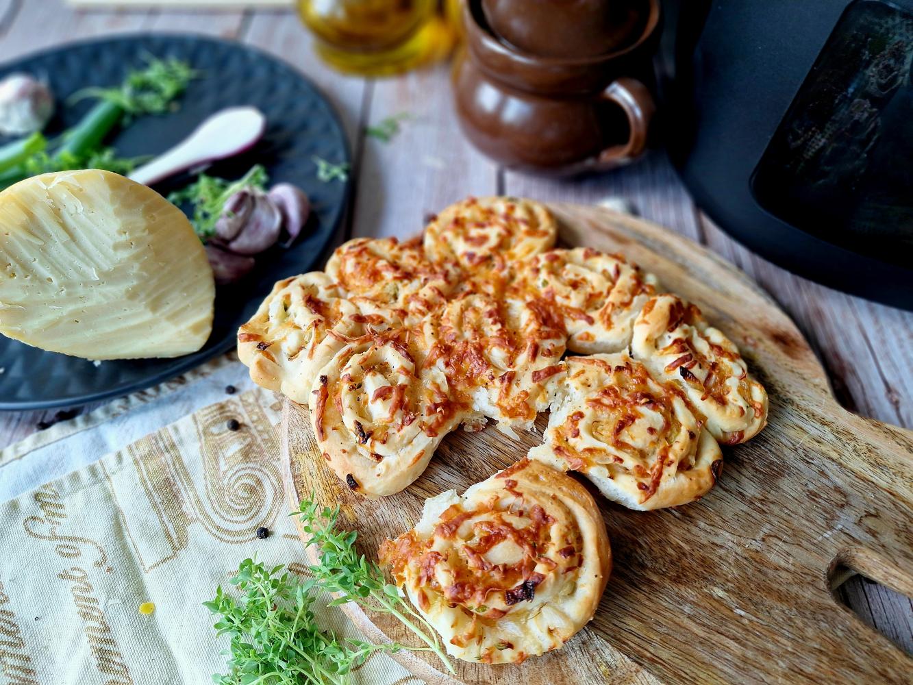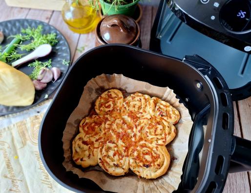 Ciasto rozwałkuj, nałóż równomiernie podsmażoną cebulę, posyp startym serem, przypraw solą i pieprzem, dodaj majeranek. ciasto zwiń, pokrój na plasterki i ułóż we frytkownicy, można dodać dodatkową porcję sera na wierzchu.