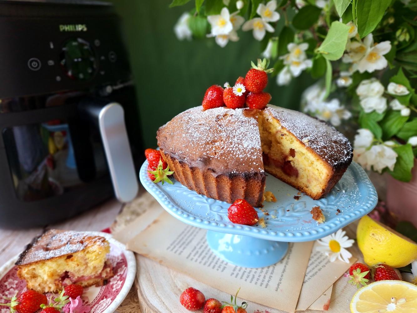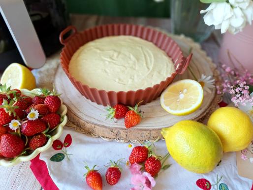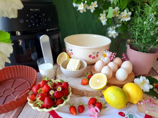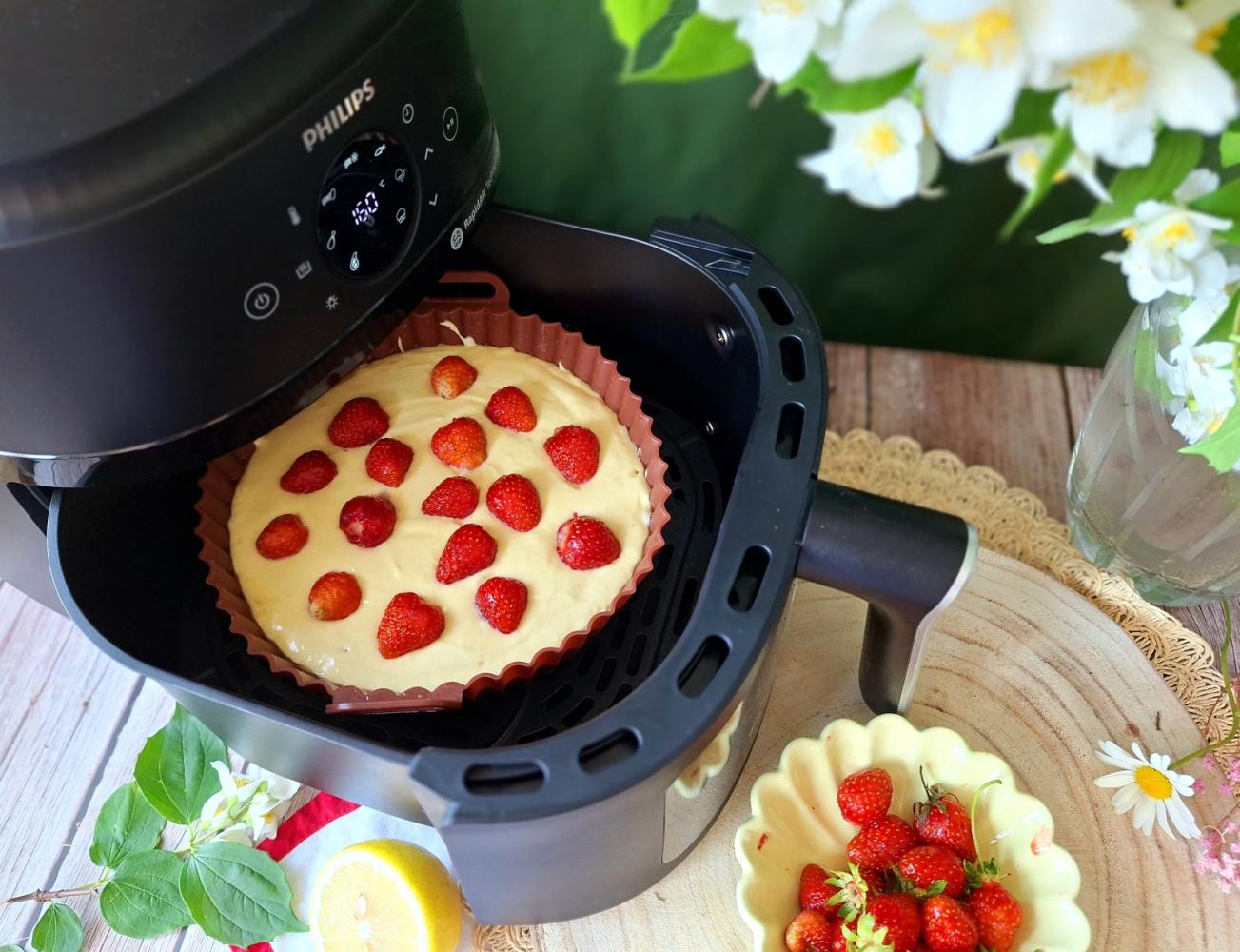 Ciasto wylewamy na formę, na wierzchu układamy truskawki.