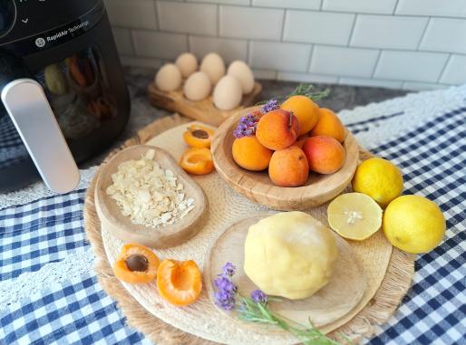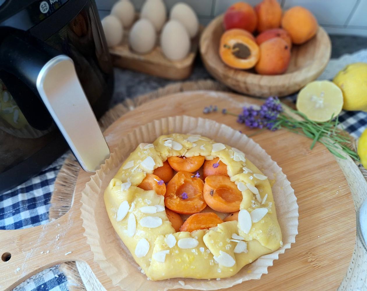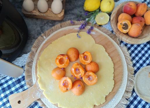 Następnie ciasto rozwałkować na grubość ok. 4 mm na kształt koła. Przenieść na papier do pieczenia. Na środku ułożyć połówki moreli, posypać cukrem pudrem i kwiatami lawendy.