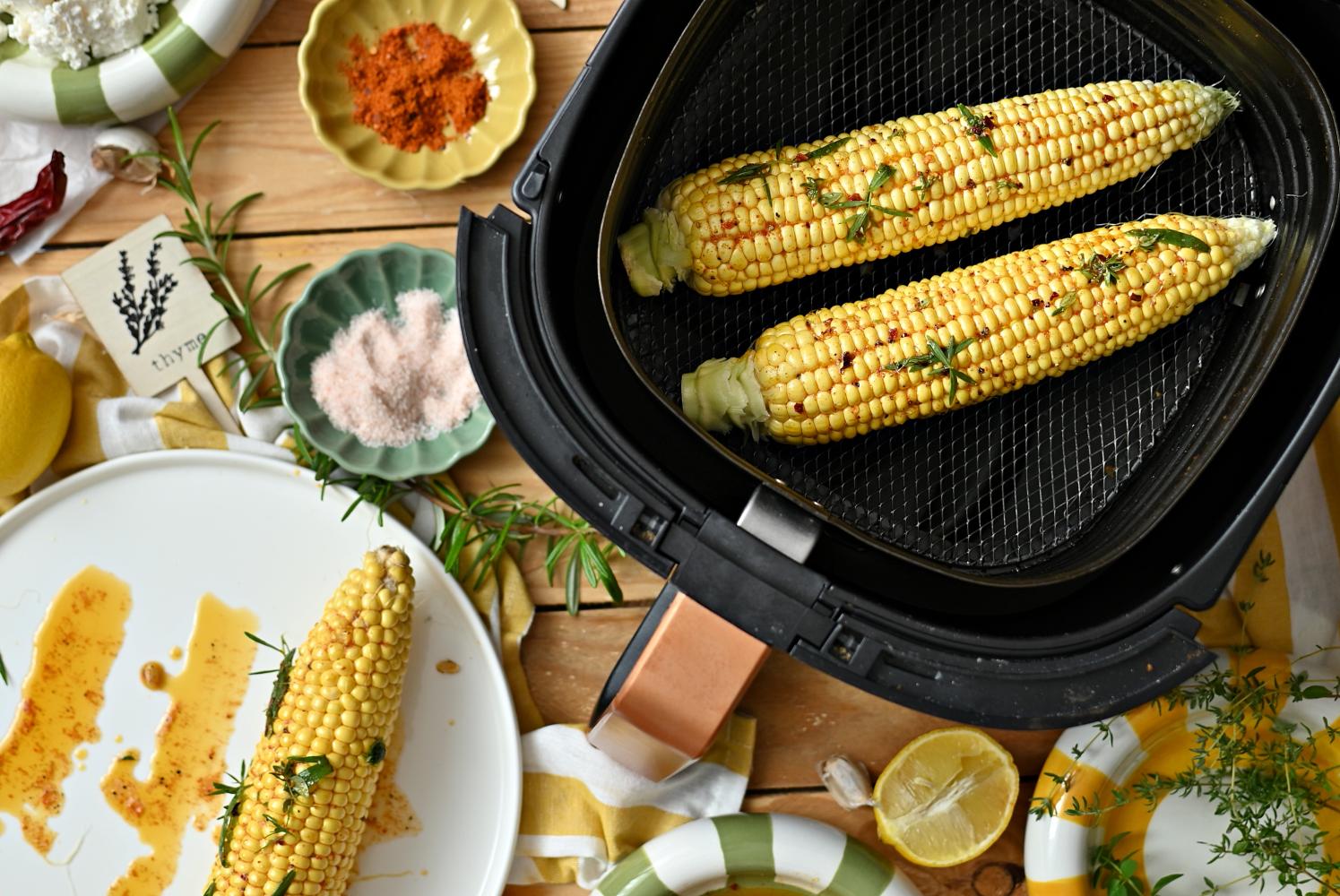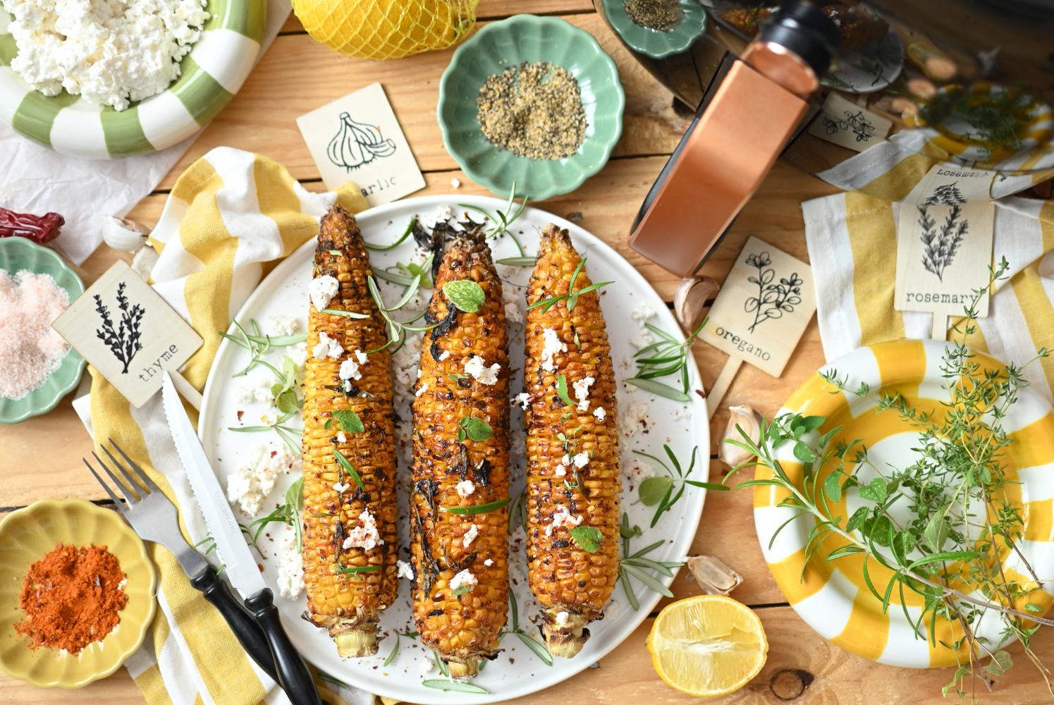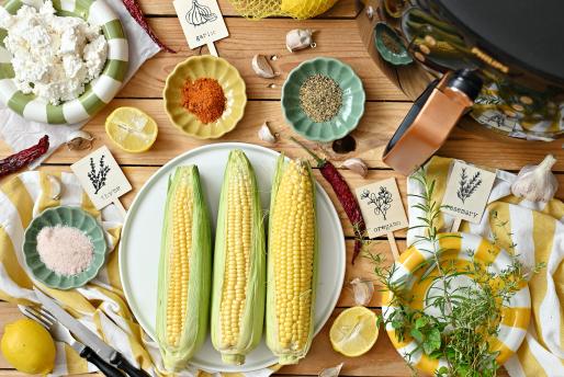 Pieczoną kukurydzę podawaj na pokruszonym twarogu ze świeżymi ziołami.