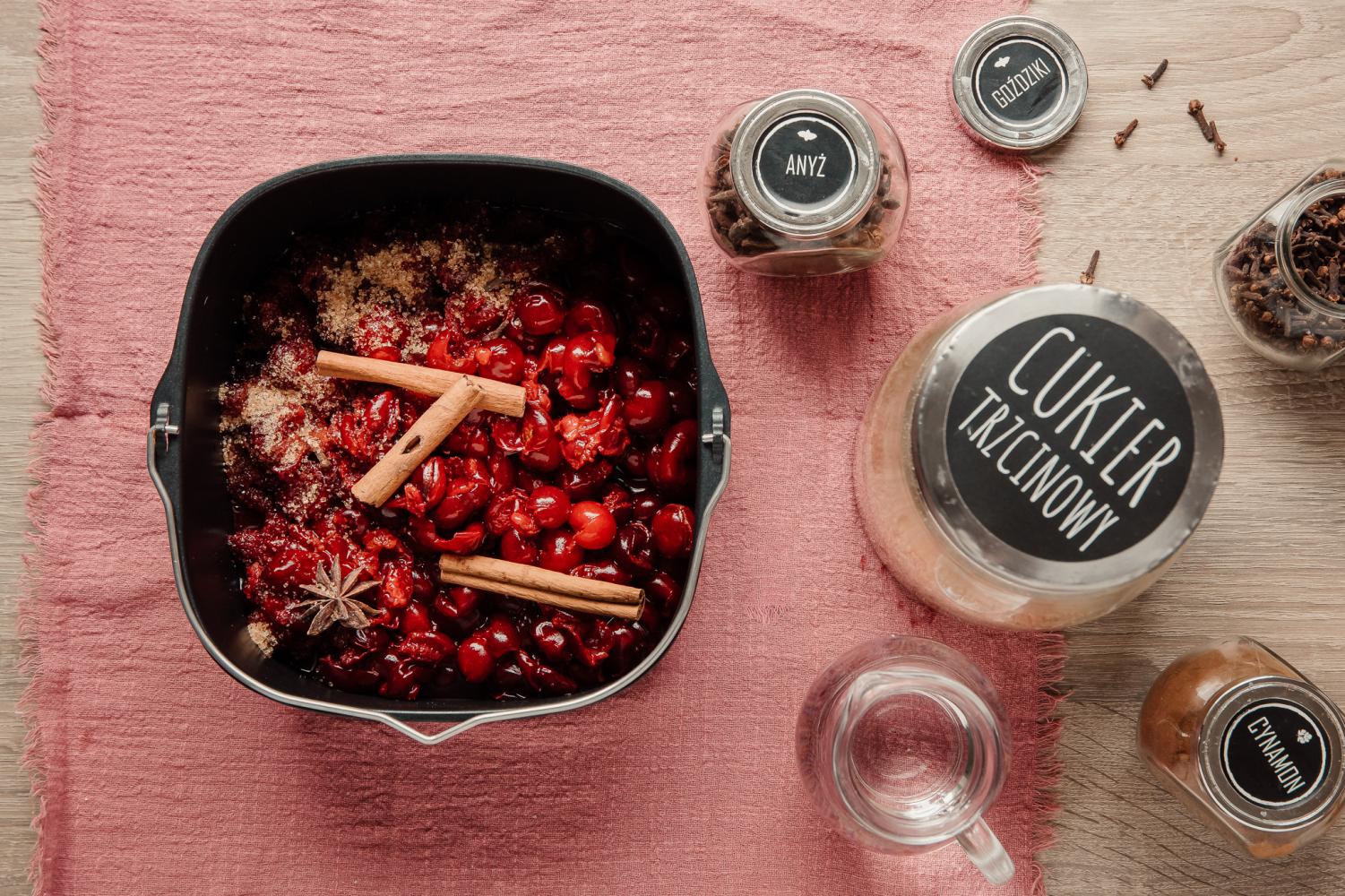 Przełóż wiśnie do misy airfryera (tej dodatkowej) i dodaj 5 łyżek cukru trzcinowego, 2 laski cynamonu, 3 goździki, 1 gwiazdkę anyżu