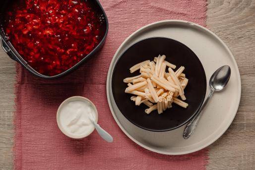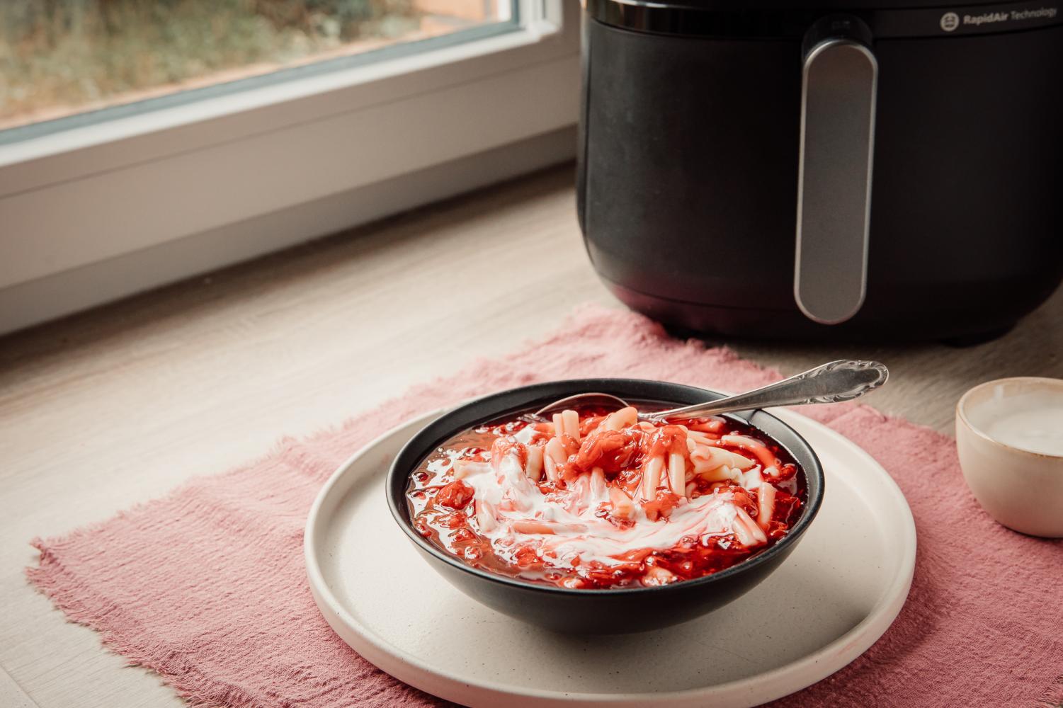 Wstaw ponownie do airfryera na 3 minuty w 180°C, by kisiel zgęstniał i połączył się z sokiem.