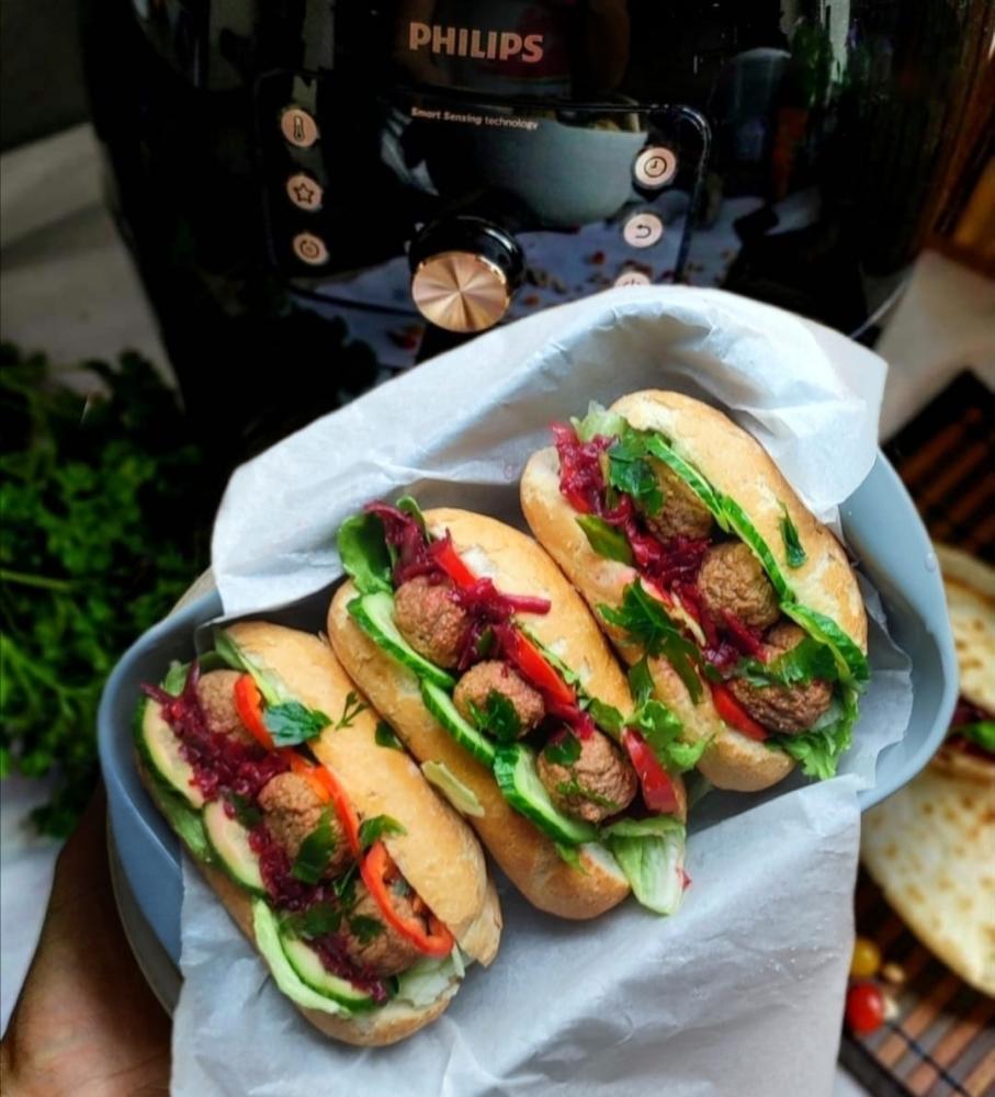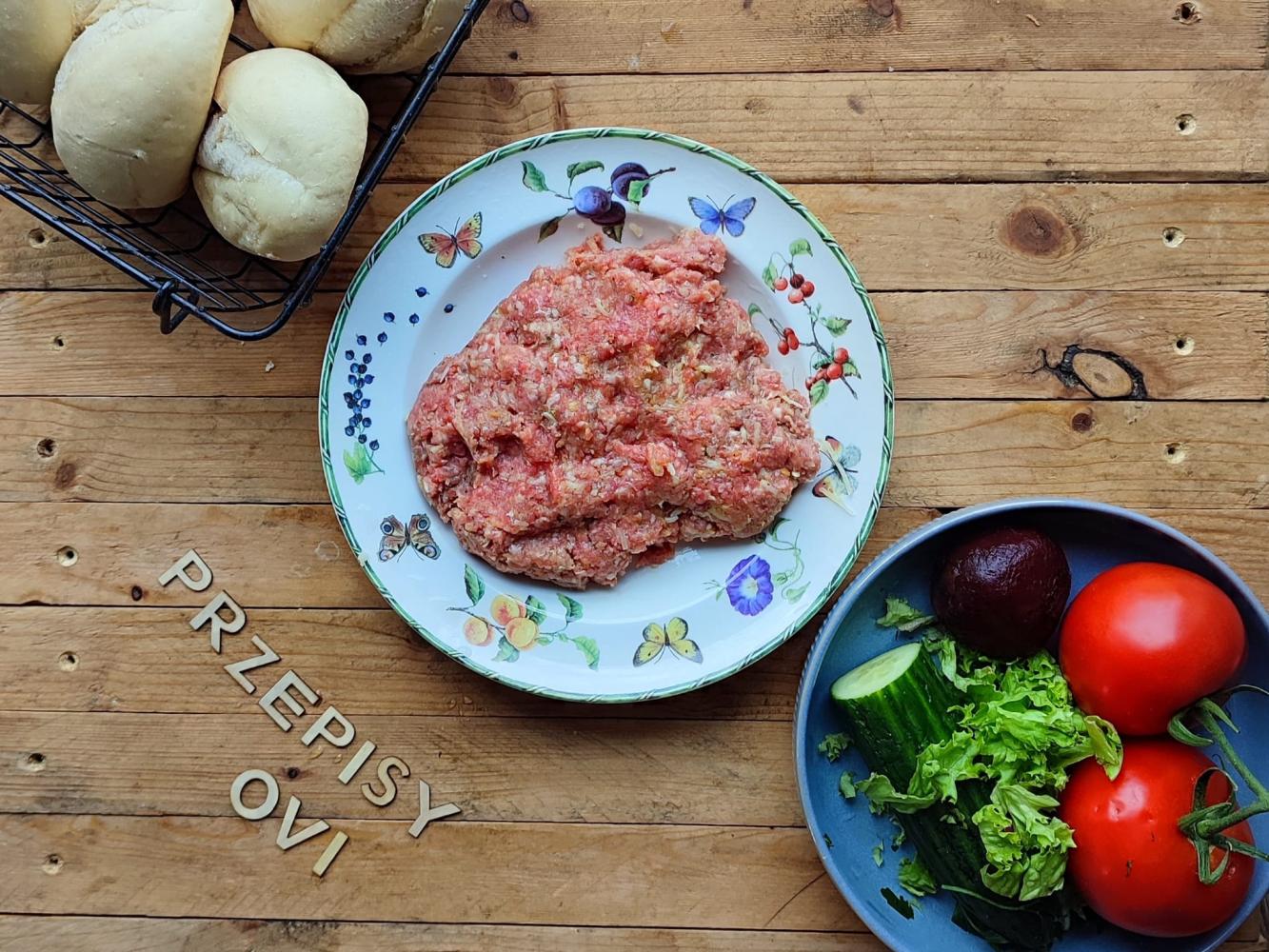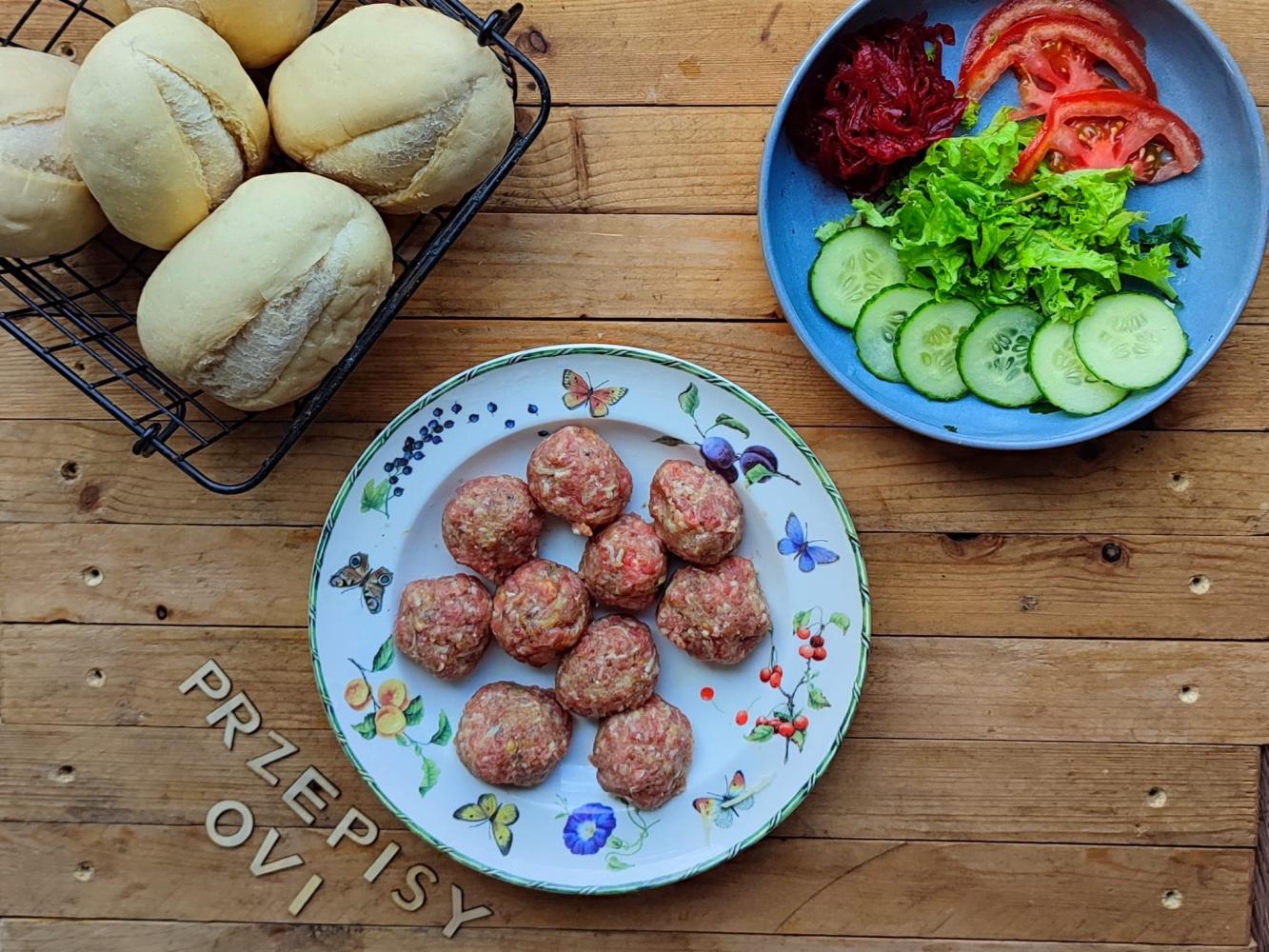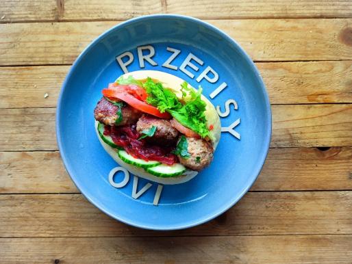 Do rozkrojonej bułki wkładamy nasze warzywa( starty buraczek, pomidor, ogórek, sałata), po 3 klopsiki i dekorujemy natką pietruszki.