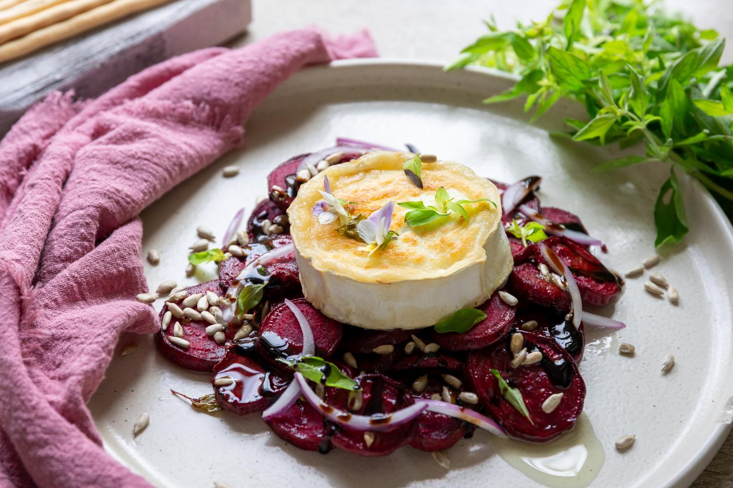 Na talerzu ułóż pieczone buraki, zapieczony ser kozi,