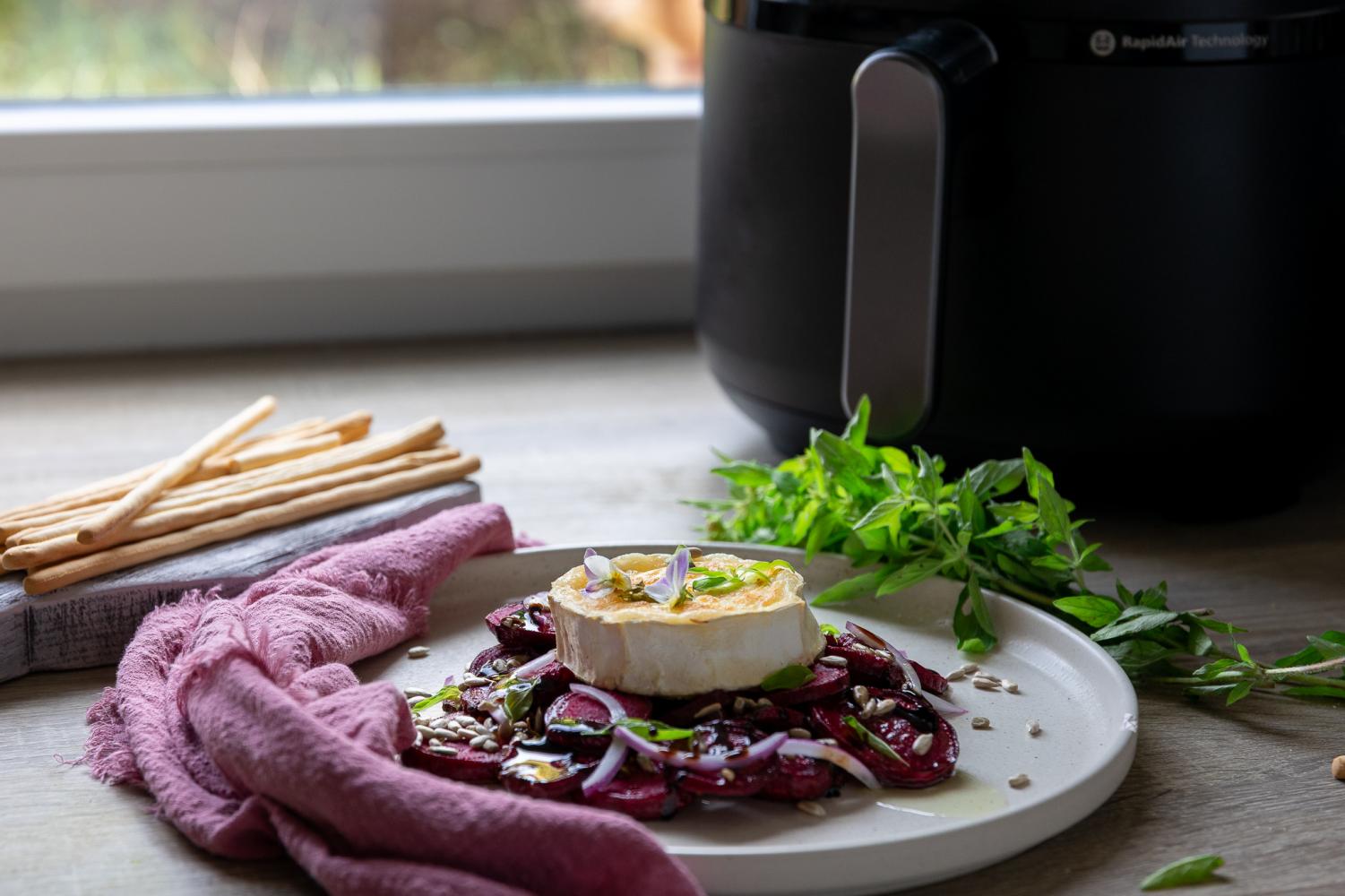 Piecz buraki w airfryerze przez 15 minut w 180°C, aż zmiękną i lekko się przypieką.