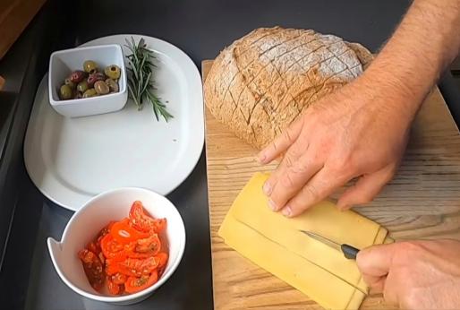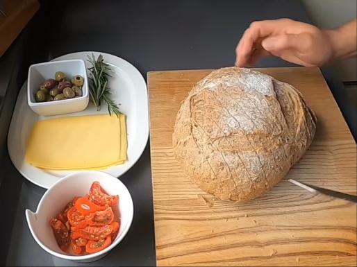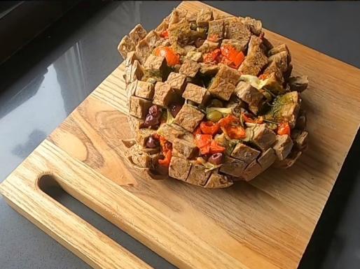 Nacinamy krzyżowo chlebek do 2/3 głebokości. Tak aby łatwo było wypełnić wgłębienia naszymi W wycięcia wkładamy ser, pomidorki. Łyżeczką nakładamy zioła i czosnek w oliwie.