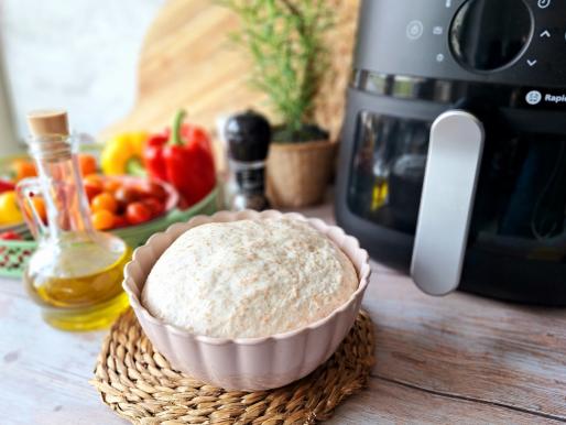 Mąkę i otręby należy wsypać do miski dodać suszone drożdże instant oraz sól, wymieszać. Wlać wodę i zagnieść ciasto. Następnie wlać oliwę i ponownie wyrabiać, aż ciasto będzie gładkie i elastyczne.