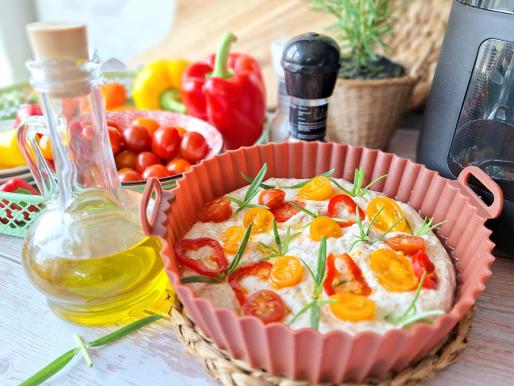 Delikatnie wcisnąć w ciasto połówki pomidorków koktajlowych, posypać gruboziarnistą solą morską, wcisnąć listkami rozmarynu i oliwą.