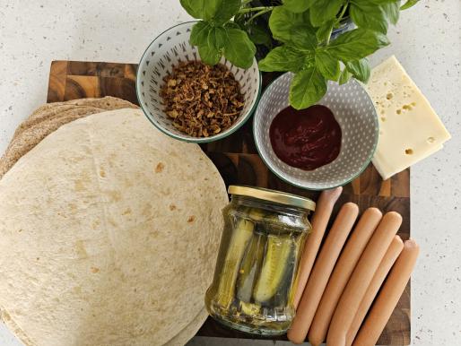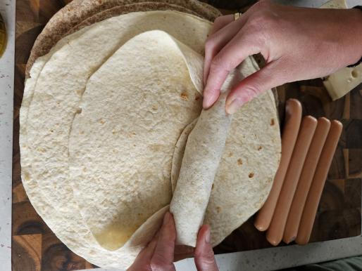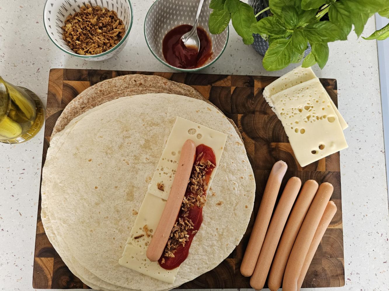 Na placku tortilla położyć ser żółty, posmarować ketchupem, położyć parówkę, posypać cebulką. Zawinąć ciasno jak naleśniki.