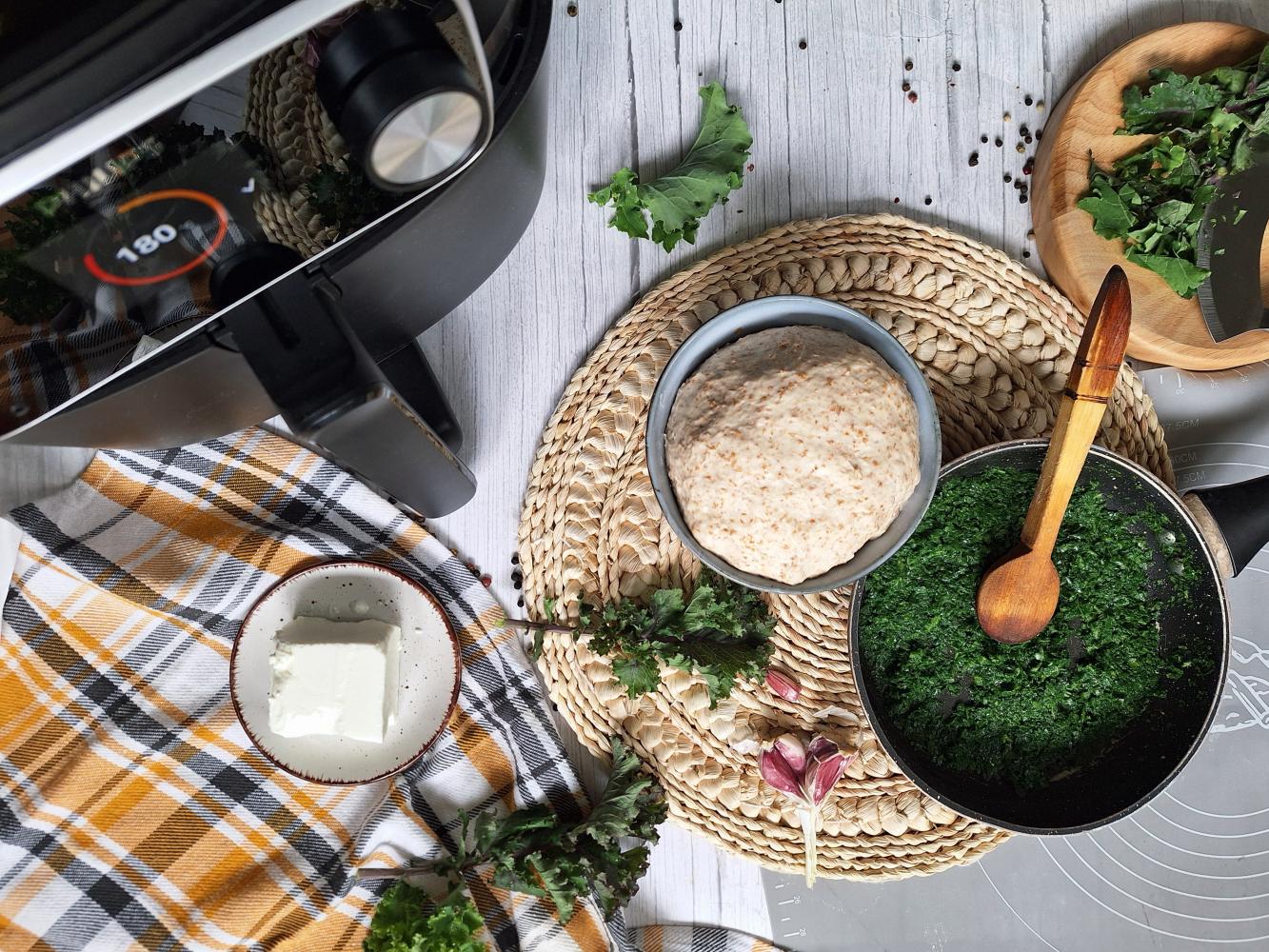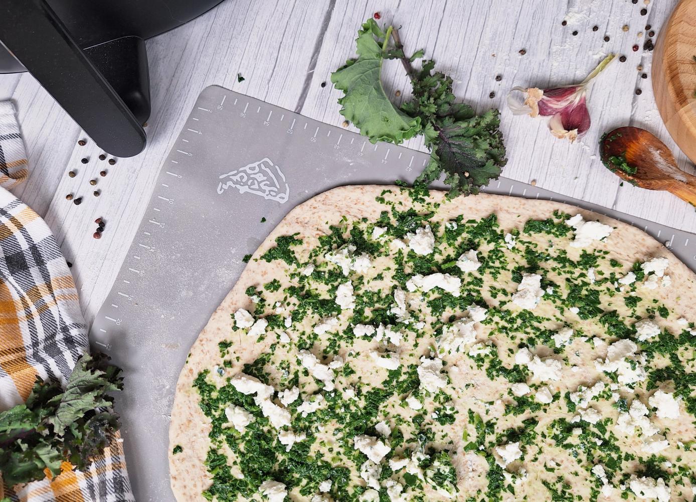 Smarujemy ciasto jarmużem, posypujemy serem feta i zawijamy w rulon wzdłuż dłuższego boku.