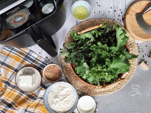 W tym czasie siekamy drobno jarmuż i dusimy na oliwie z pokrojonego czosnku. Doprawiamy do smaku.